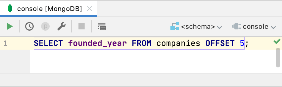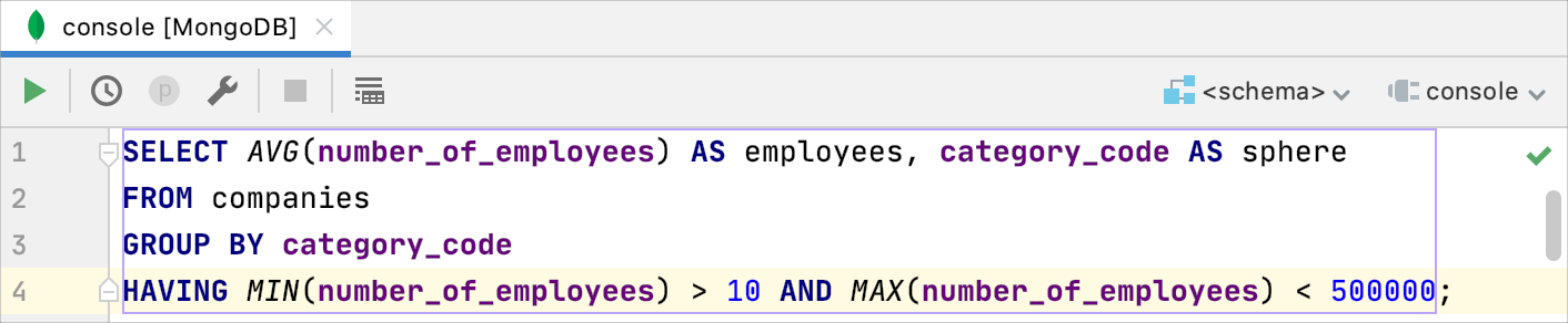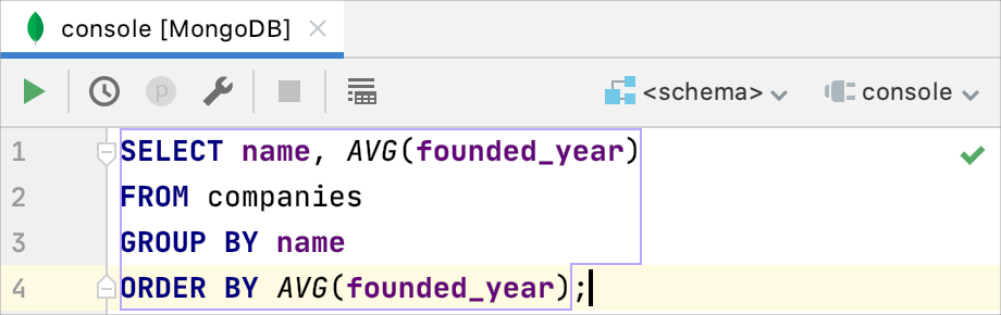 In MongoDB and Amazon DocumentDB, to manipulate data or perform other operations, you write scripts for the mongo shell in JavaScript. For developers who query data primarily with SQL, it might be helpful to use SQL for MongoDB or Amazon DocumentDB collections as well. GoLand will translate your SQL queries to JavaScript.