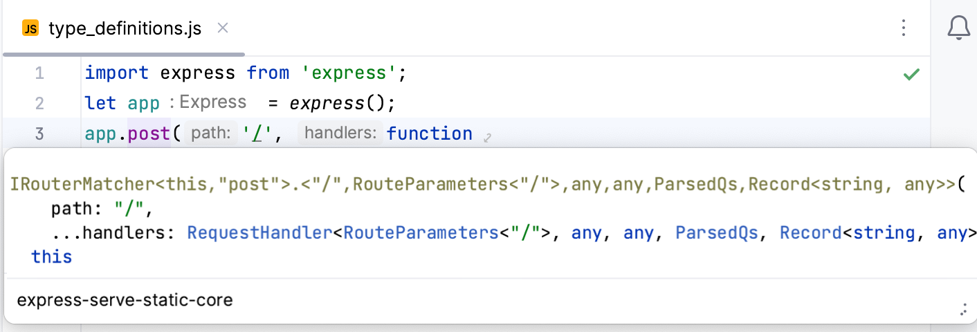 importorrequirestatement with this library or framework, press Alt+Enter, and choose Install TypeScript definitions for better type information: