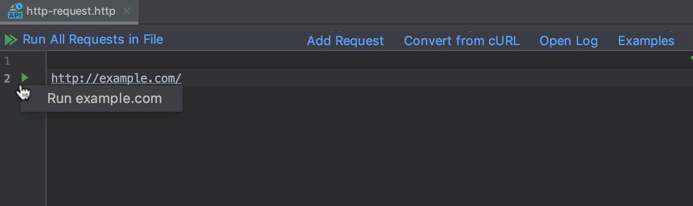 Click . If a request file is opened in the editor, this will add a request template to the opened file. Otherwise, this will create a new .http scratch file.