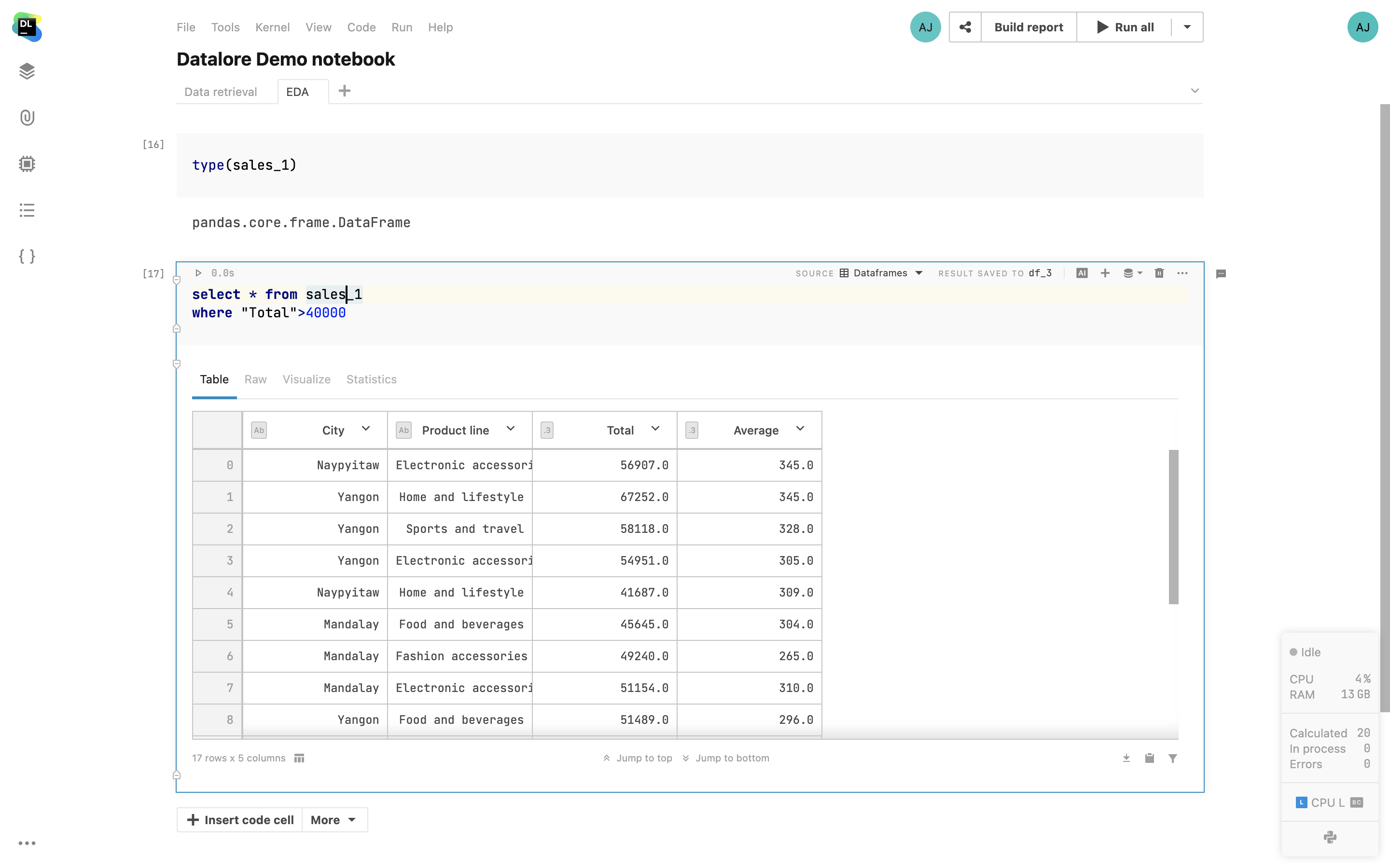 Whether you work with CSV files, S3 buckets, or SQL databases, Datalore offers you easy ways to access and query your data from multiple data sources in one notebook.