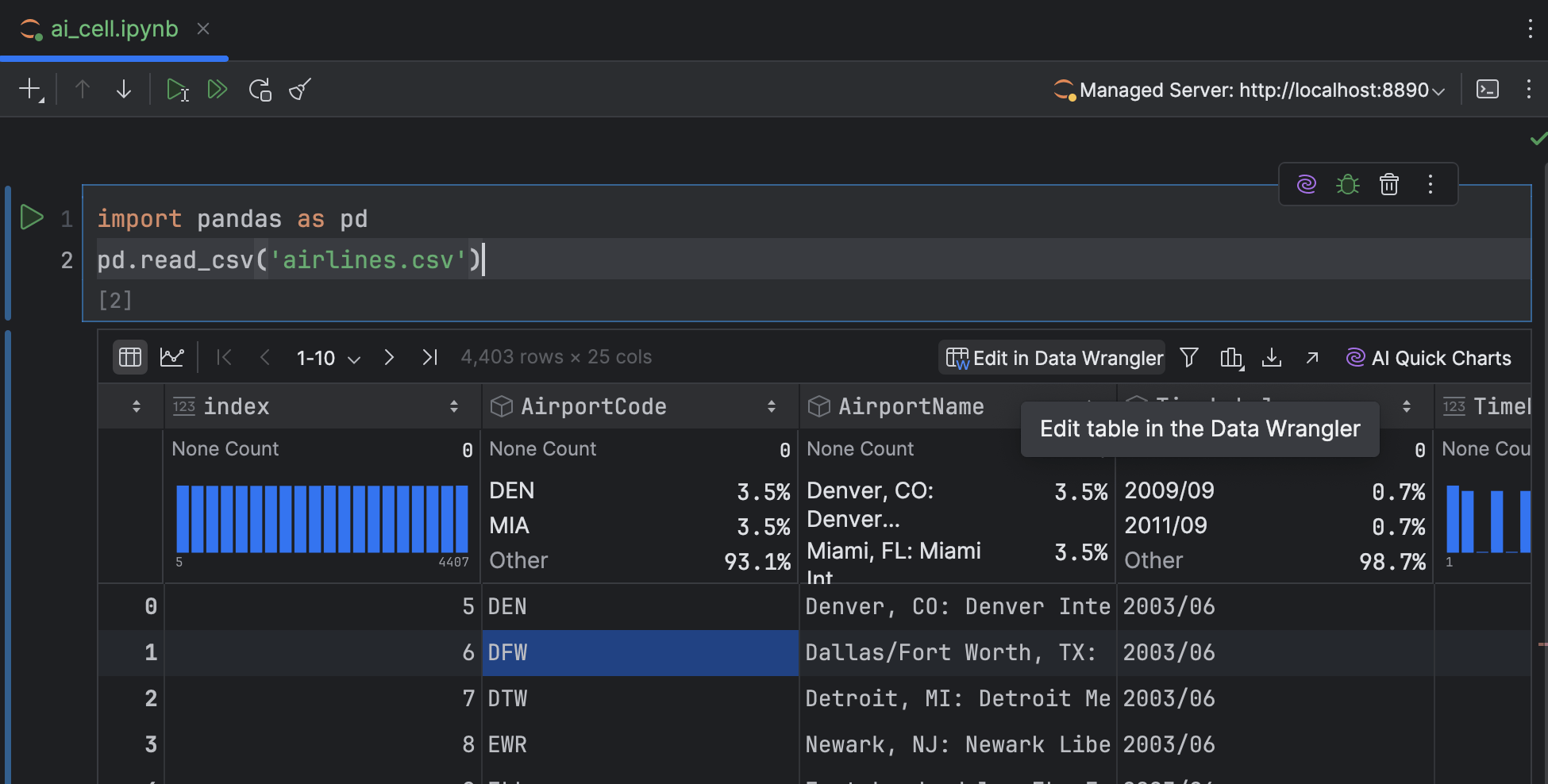 Wrangle your data with AI via the Data Viewer button, AI transformations in Data Wrangler, or by enabling Data Wrangler mode in AI Assistant.