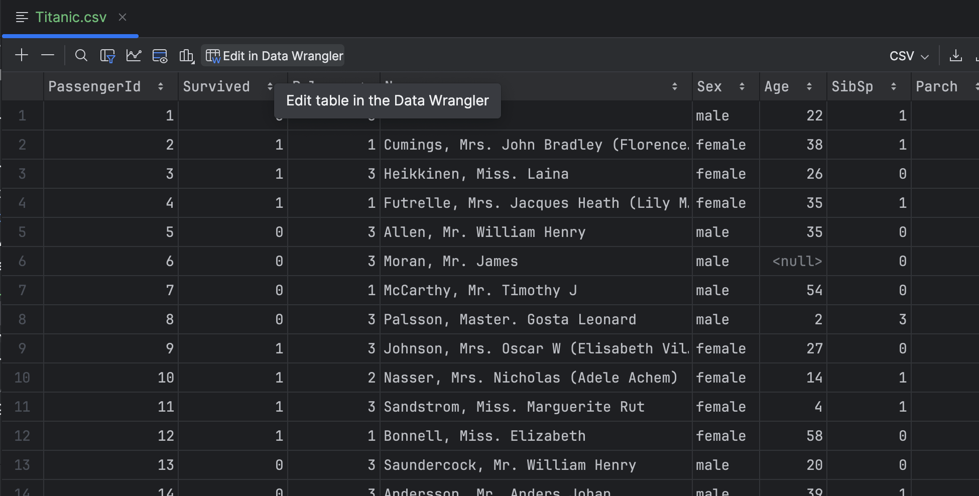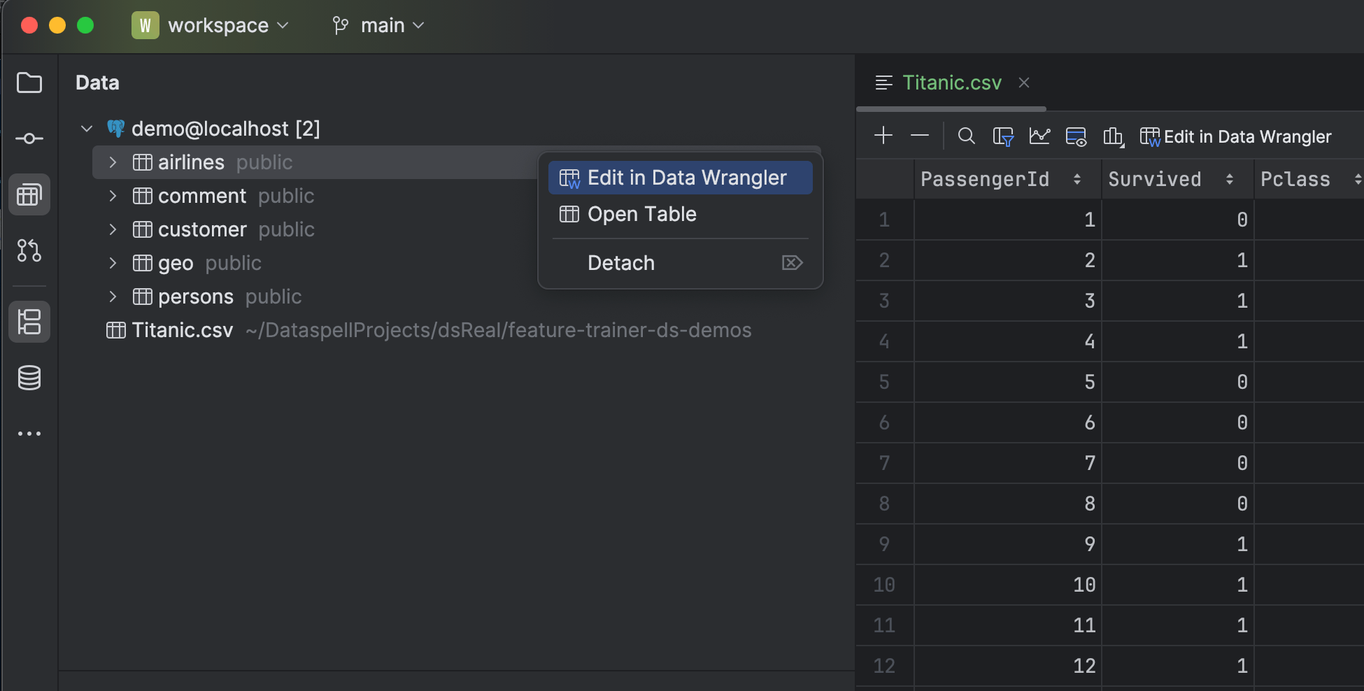 Invoke Data Wrangler easily from the Data tool window or directly within the table data viewer.