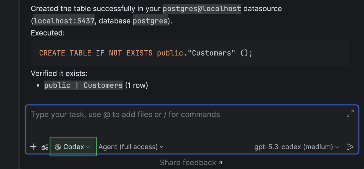 The AI chat integration with Codex and Claude Agent now offers full, native support for your connected databases. You can now query, analyze, and modify your database state using natural language right from the IDE.