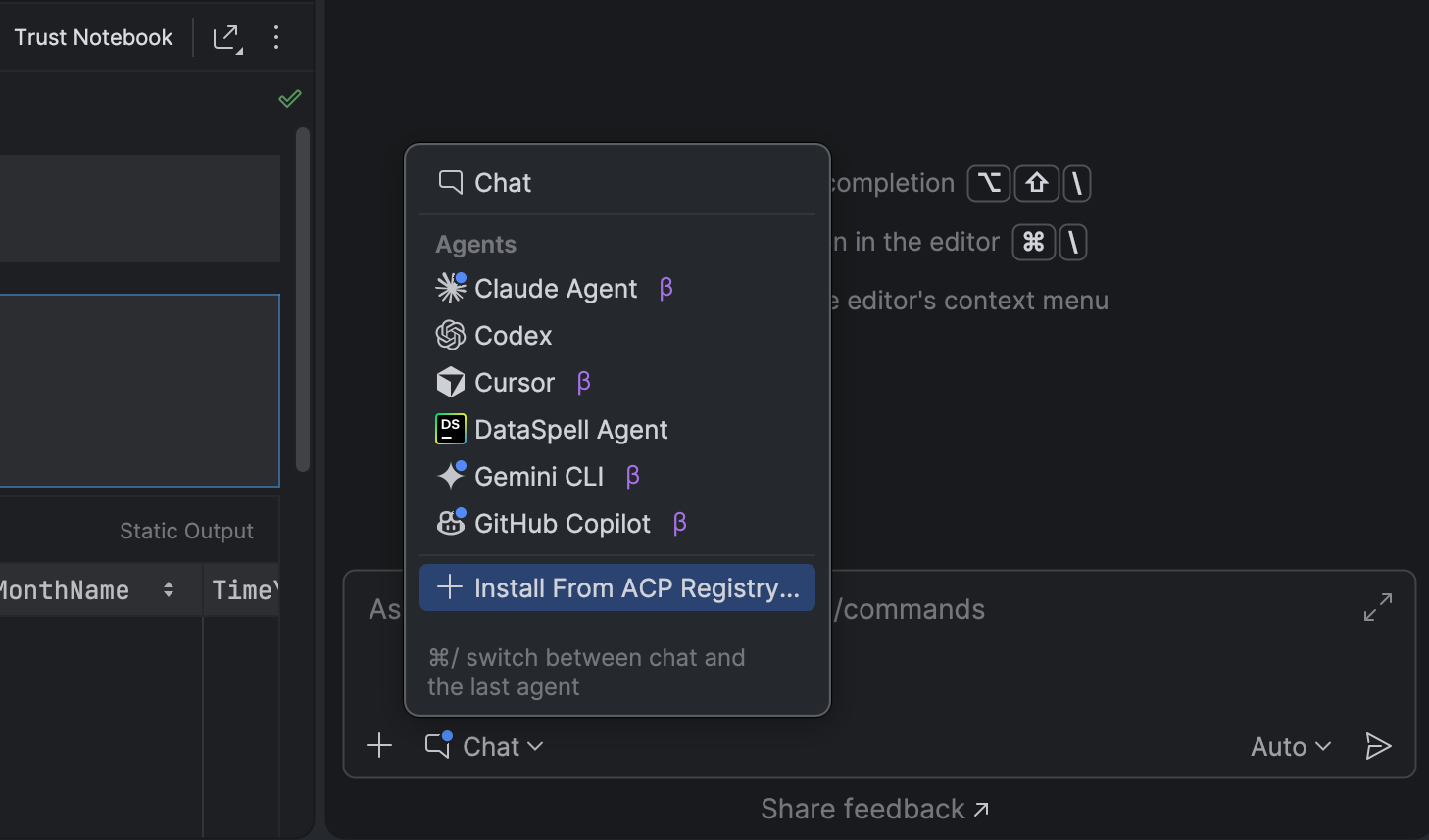 In addition to Claude Agent, and most recently Codex, DataSpell now lets you work with more AI agents directly in the AI chat. You can choose from agents such as GitHub Copilot, Cursor, and many others supported through the Agent Client Protocol (ACP).