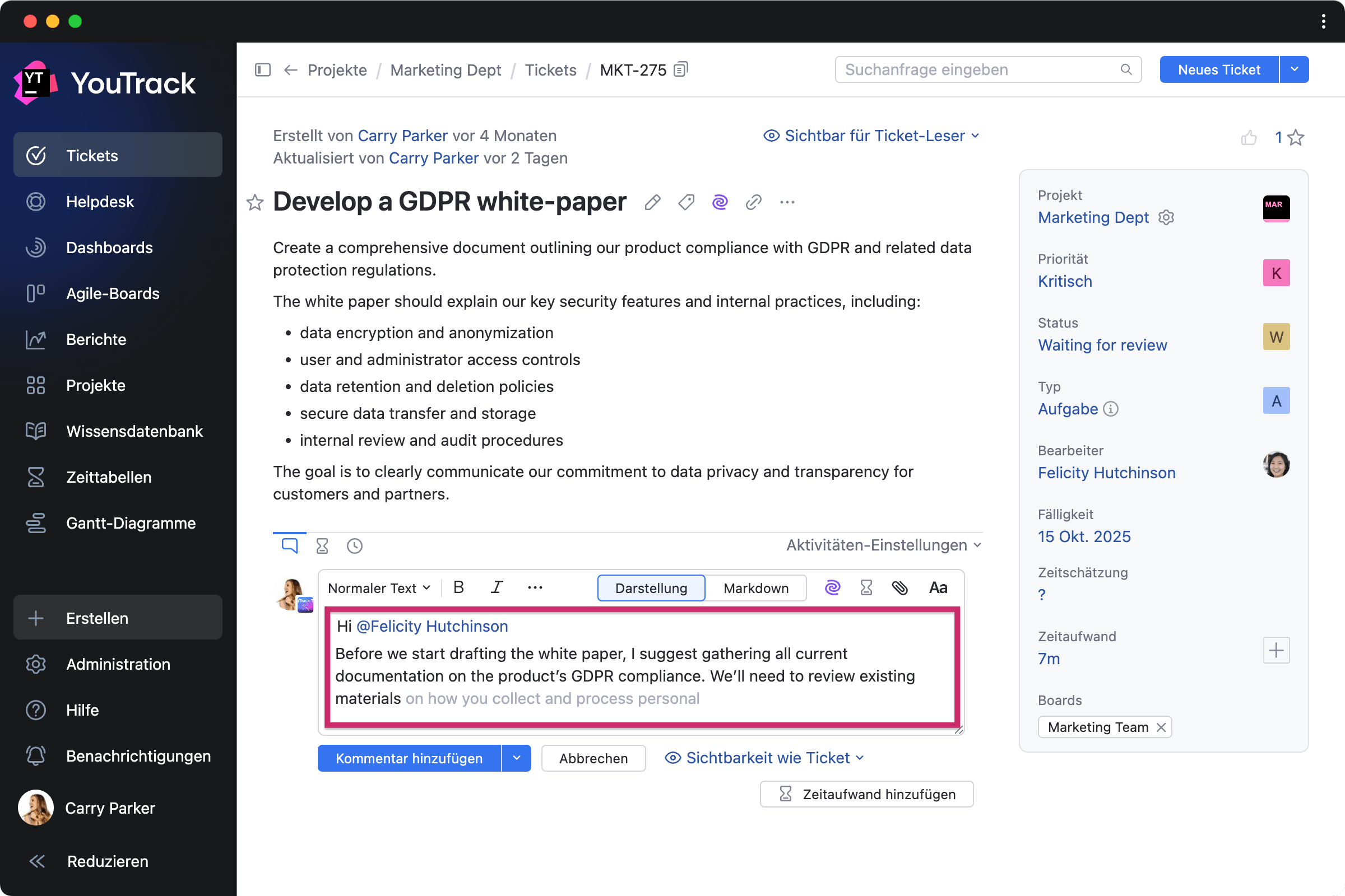 Der auf JetBrains AI basierende Schreibassistent korrigiert Ihre auf Englisch oder Deutsch geschriebenen Texte überall in YouTrack – in Aufgaben, Artikeln, Supportfällen und Kommentaren. Grammatik, Rechtschreibung und Zeichensetzung werden während des Schreibens automatisch überprüft. Die Schreibhilfe-Funktion bietet auch Textvervollständigung und schlägt während der Eingabe Wörter und Ausdrücke vor.
