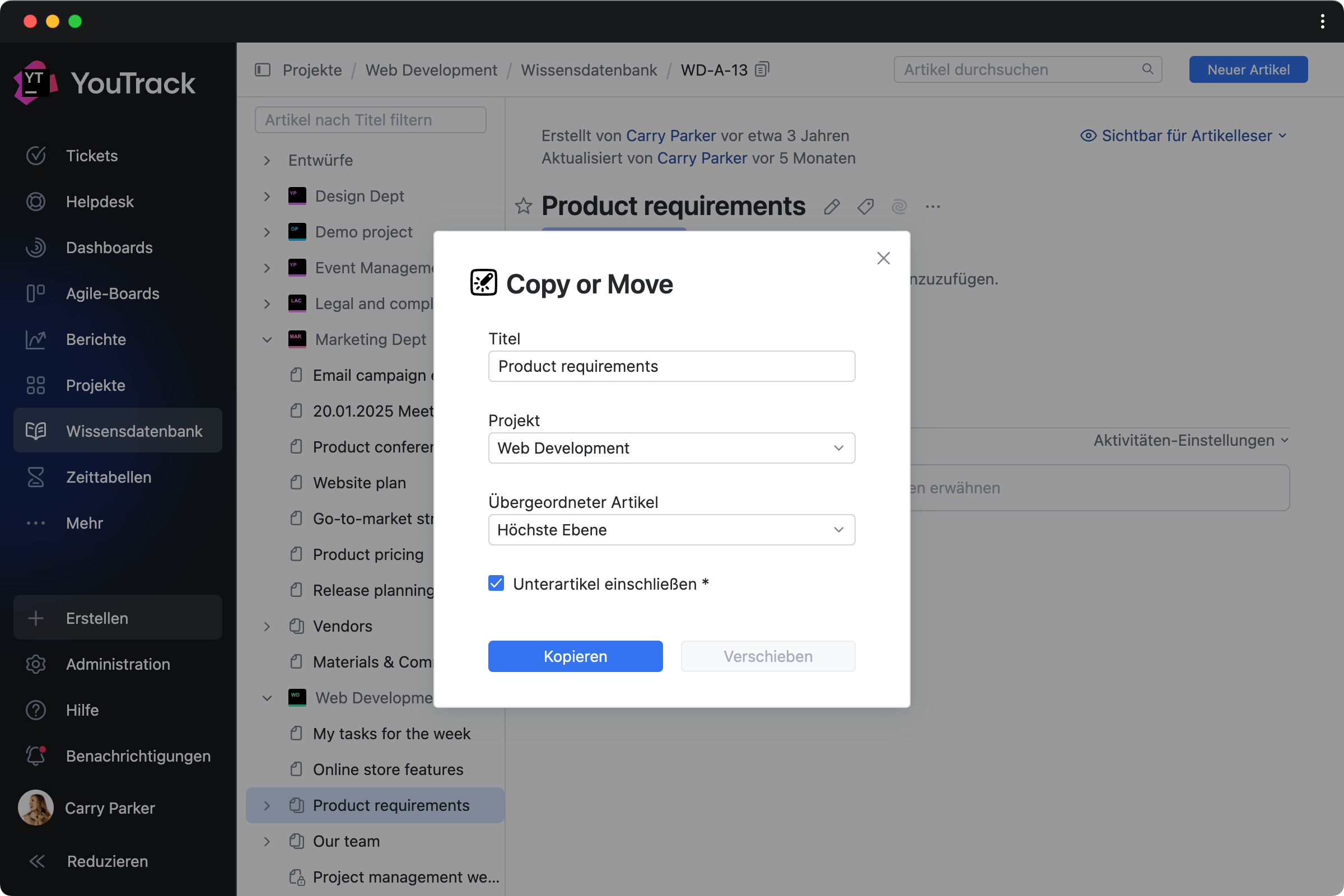 Kopieren und verschieben Sie Artikel zusammen mit ihren Unterartikeln innerhalb der Knowledge Base.