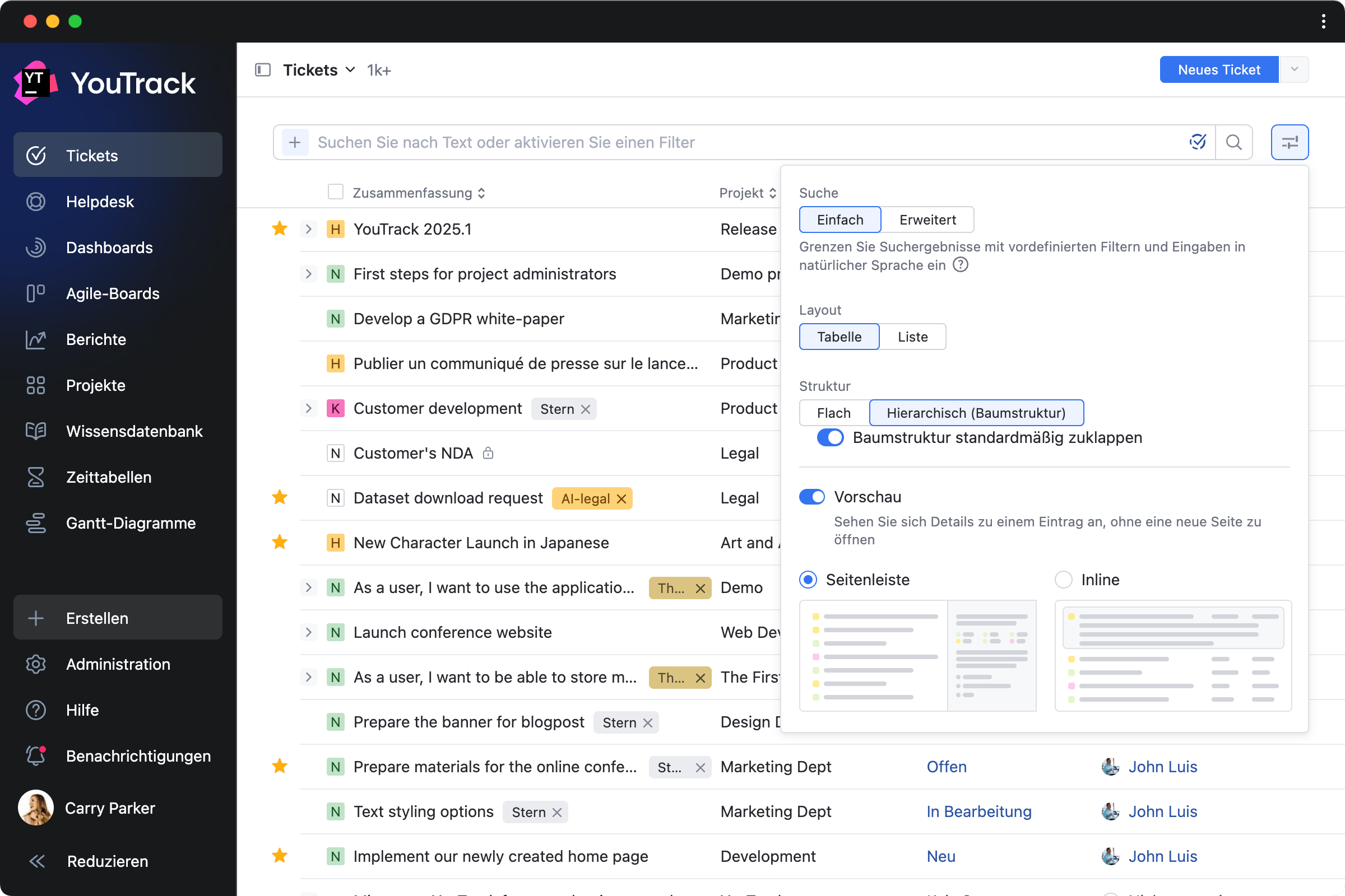 Beim Einrichten Ihres Arbeitsbereichs und Ihrer Aufgabenansichten stehen Ihnen zahlreiche Optionen zur Verfügung. Sie können unkompliziert zwischen Listen- und Tabellenansichten wechseln und diese so gestalten, dass sie das genau richtige Maß an Details enthalten. Viele Felder lassen sich direkt in den Ticketansichten bearbeiten, um Ihnen Zeit und Mühe zu sparen, und eine Schnellvorschau kann Kontextwechsel vermeiden. Sortierungs- und Gruppierungsoptionen nach mehreren Feldern erleichtern die Verwaltung langer Aufgabenlisten.