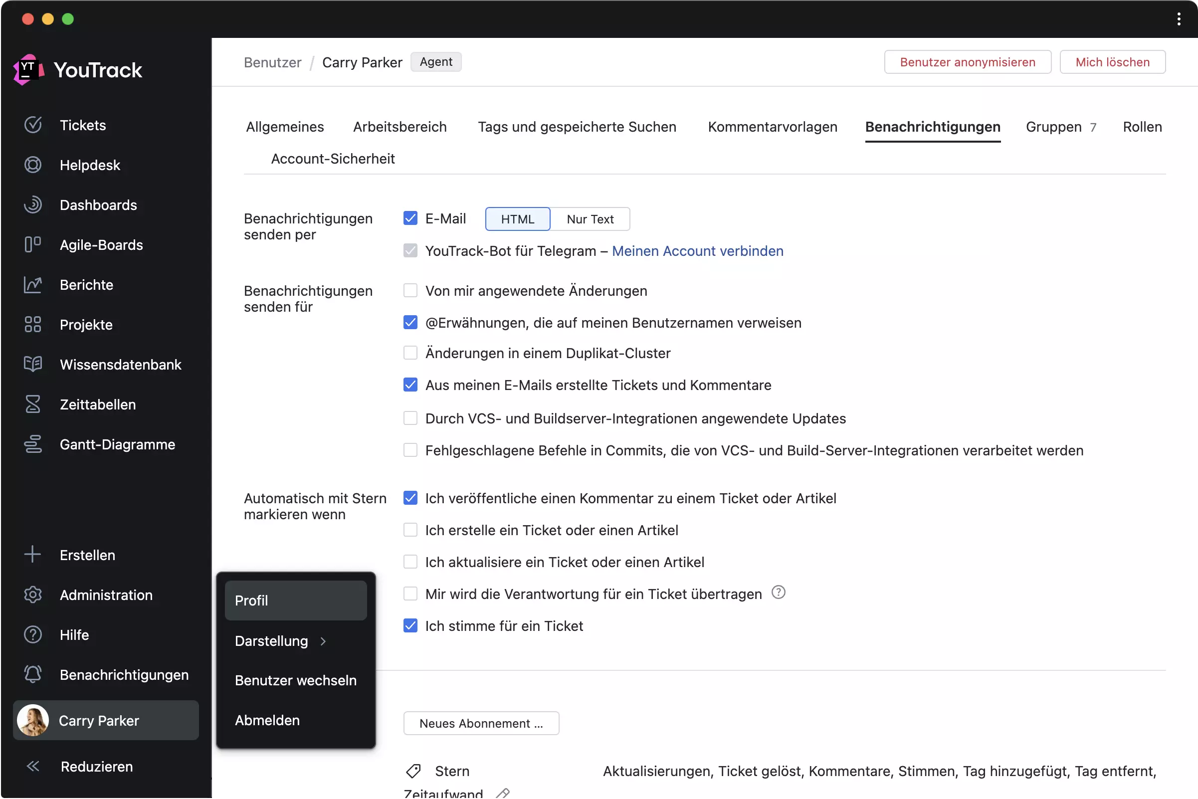 In Ihren Benachrichtigungseinstellungen können Sie genau festlegen, welche Arten von E-Mail-Benachrichtigungen Sie erhalten möchten. Sie können sie sogar vollständig deaktivieren, denn YouTrack bietet Ihnen viele weitere Möglichkeiten, auf dem Laufenden zu bleiben!