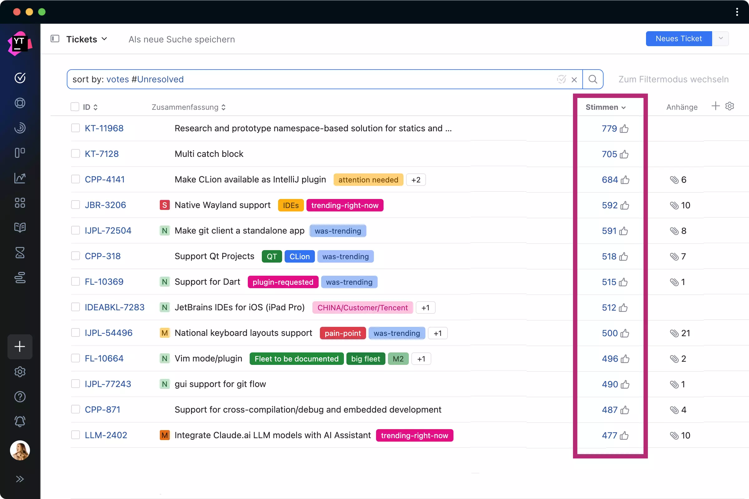 Die Abstimmung über Tickets bietet eine einfache Möglichkeit, Ihr Backlog zu priorisieren und Ihr Team und Ihre Kunden in die Gestaltung Ihrer Produkte und Services einzubeziehen.
