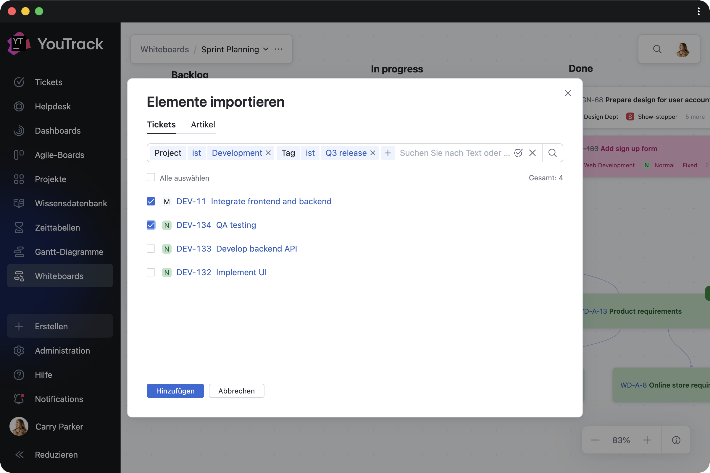 Übernehmen Sie bestehende Aufgaben, Supportfälle und Artikel auf das Whiteboard und aktualisieren Sie sie nach Planänderungen direkt. Jede Änderung ist sofort in allen Ihren Projekten sichtbar. Fügen Sie Aufgaben aus dem Backlog zu einer Planungssitzung hinzu, verknüpfen Sie relevante Artikel oder nutzen Sie Ihr Whiteboard für einen dynamischen Überblick über laufende Arbeiten.