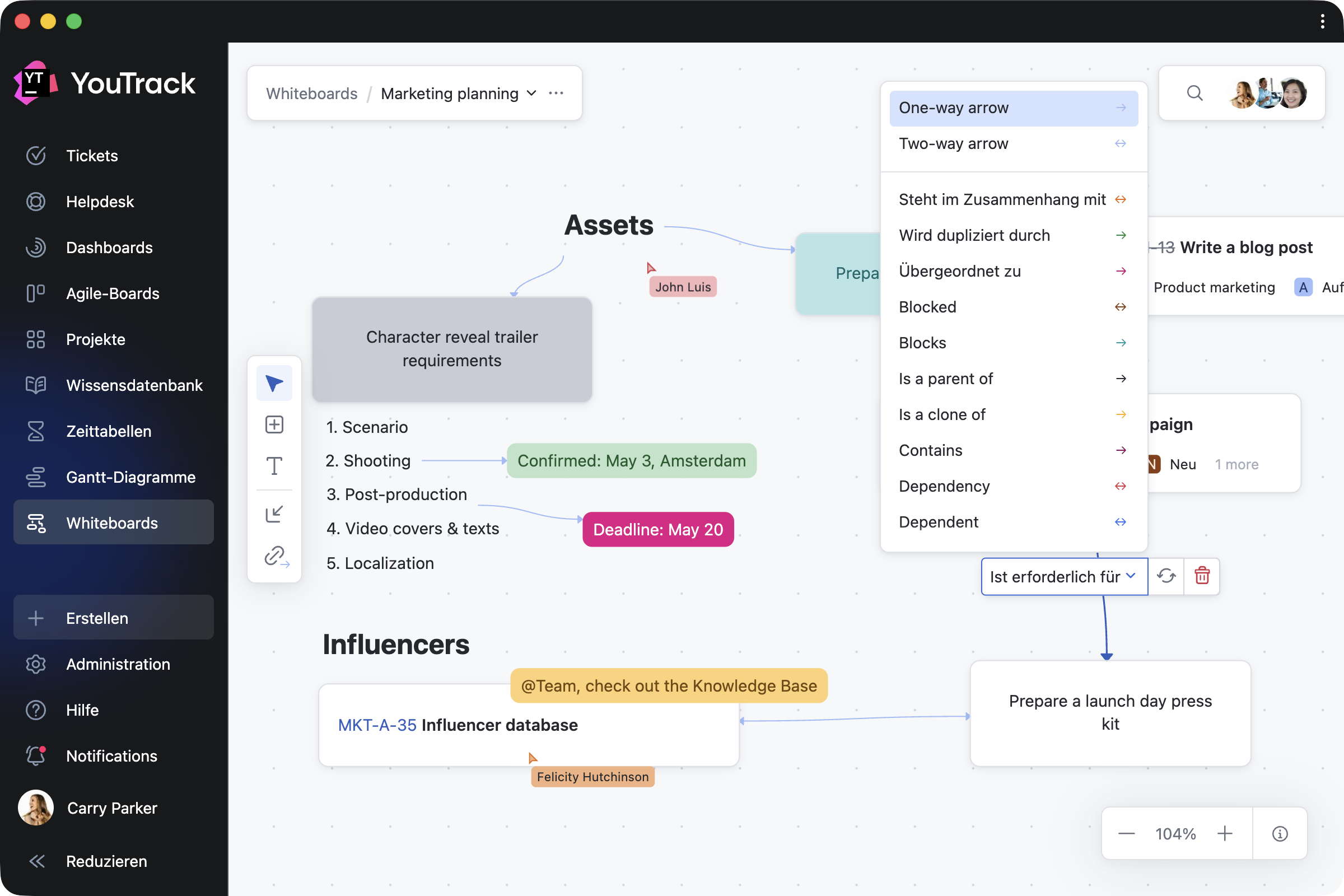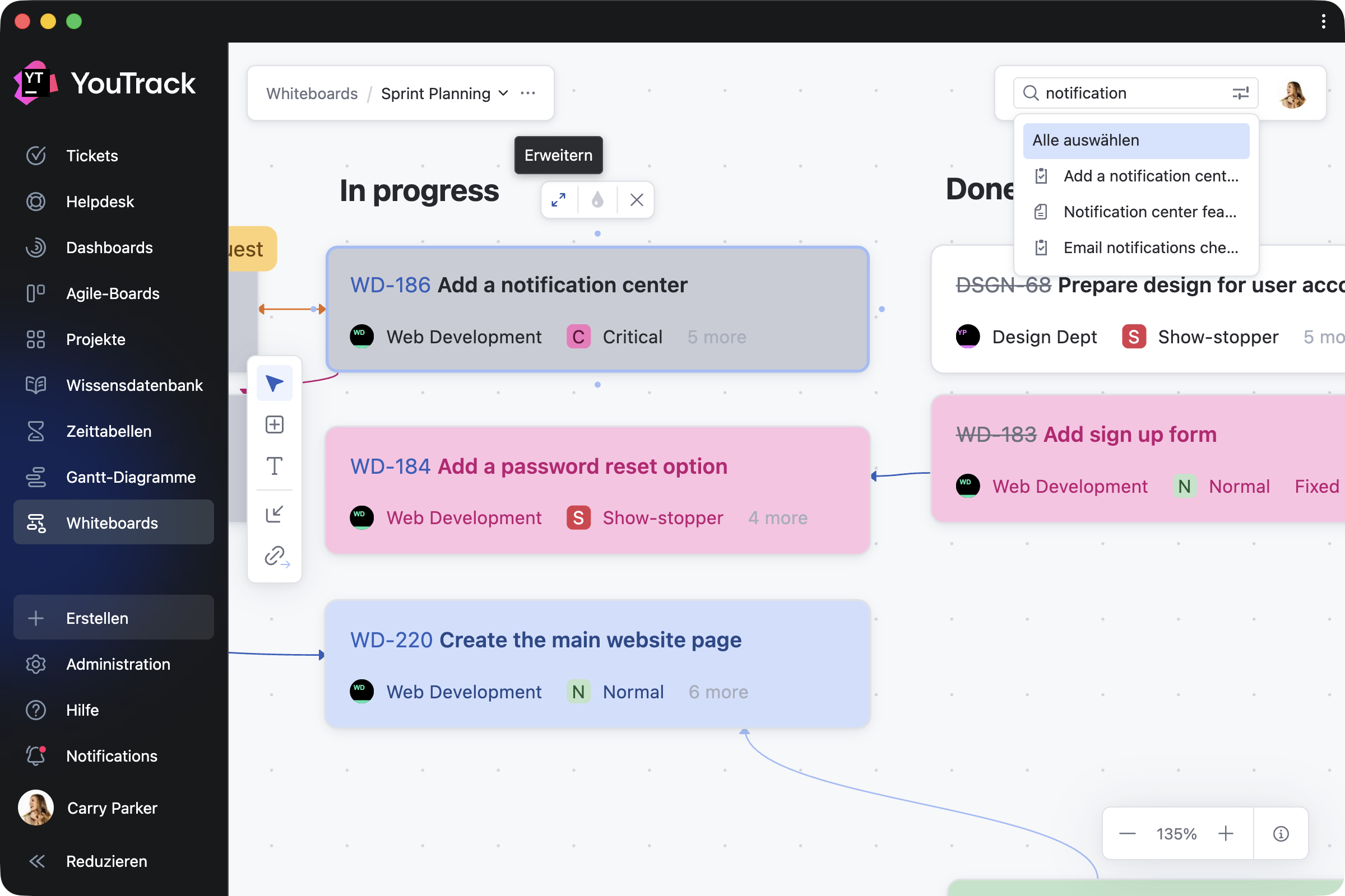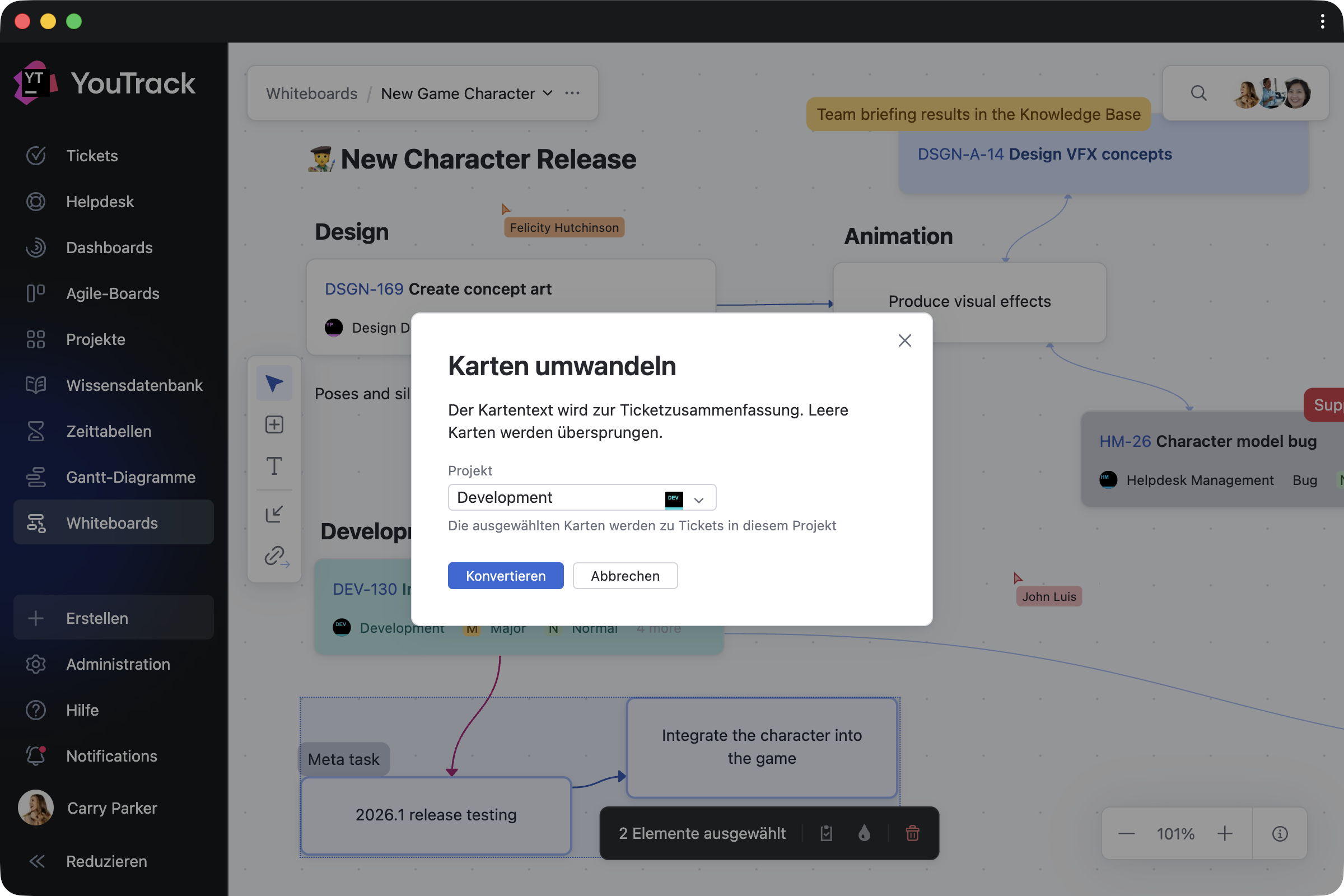 Wählen Sie eine beliebige Karte aus, suchen Sie das passende Projekt, fügen Sie Details hinzu – und schon haben Sie ein YouTrack-Ticket oder einen Artikel angelegt. Sie können die Elemente einzeln oder alle auf einmal nach Abschluss Ihrer Brainstorming-Sitzung umwandeln. Aufgabenabhängigkeiten werden ohne jeden weiteren Aufwand automatisch synchronisiert.