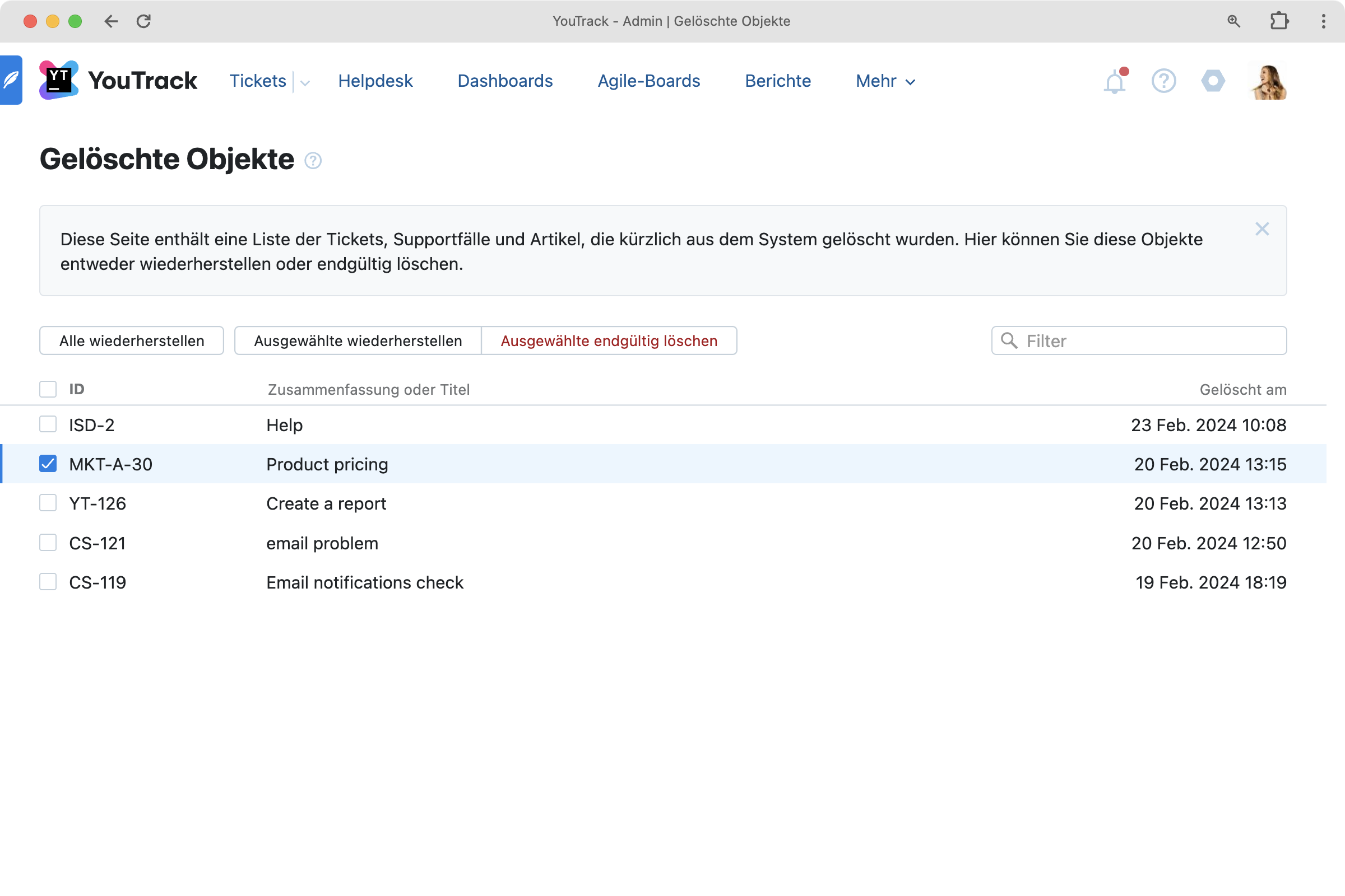 Manchmal kommt es vor, dass wichtige Tickets, Supportfälle oder Artikel unbeabsichtigt gelöscht werden. Ihre Admins können diese Inhalte jetzt innerhalb von zwei Wochen nach ihrer Löschung unkompliziert wiederherstellen. Wenn Sie bestimmte Inhalte absichtlich gelöscht haben, haben Sie jetzt außerdem die Möglichkeit, diese Inhalte endgültig zu entfernen, um Speicherplatz freizugeben. Um sich darüber zu informieren, welche Objekte gelöscht oder wiederhergestellt wurden, können Sie einfach die Benachrichtigungen und den Aktivitätsstream überprüfen.