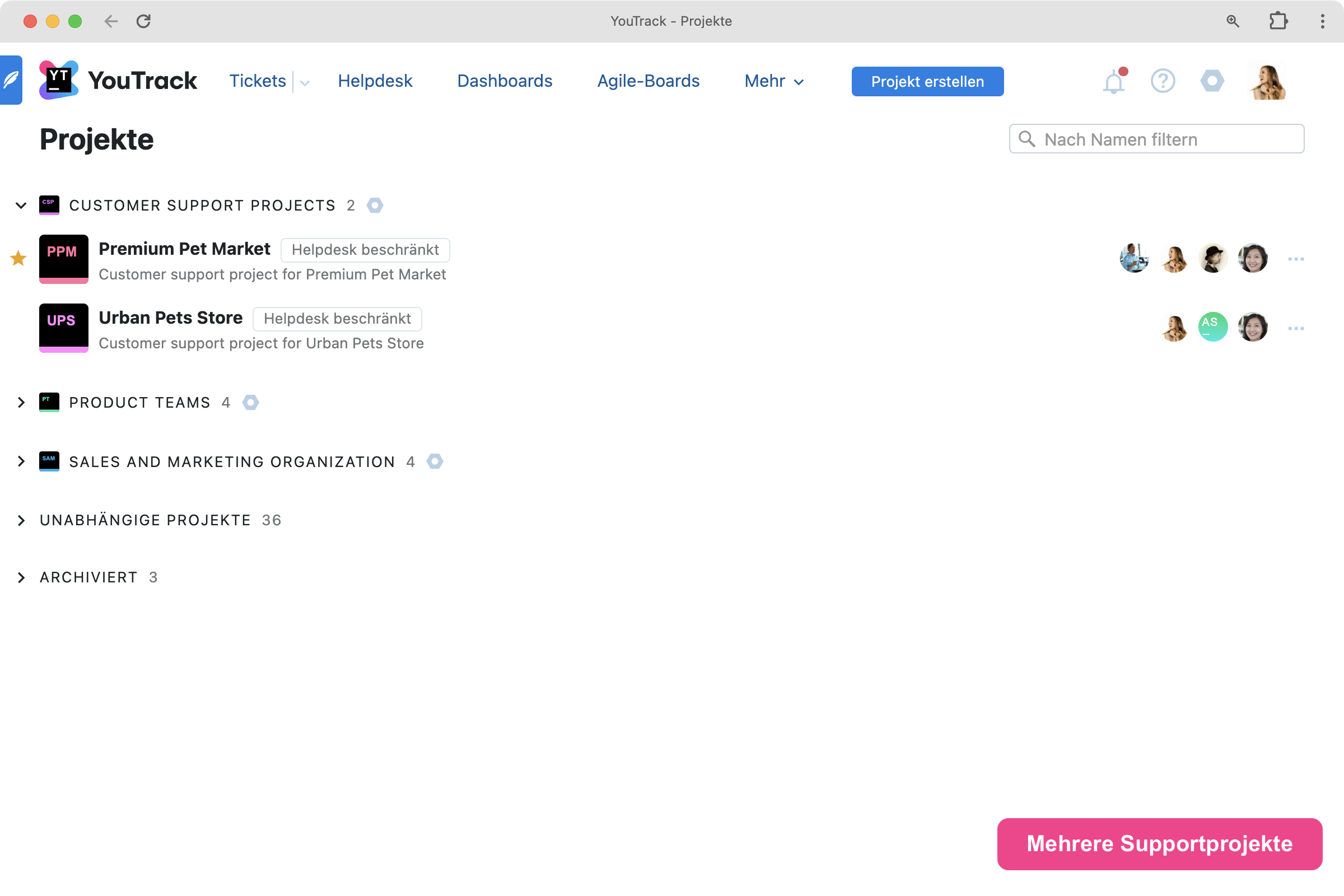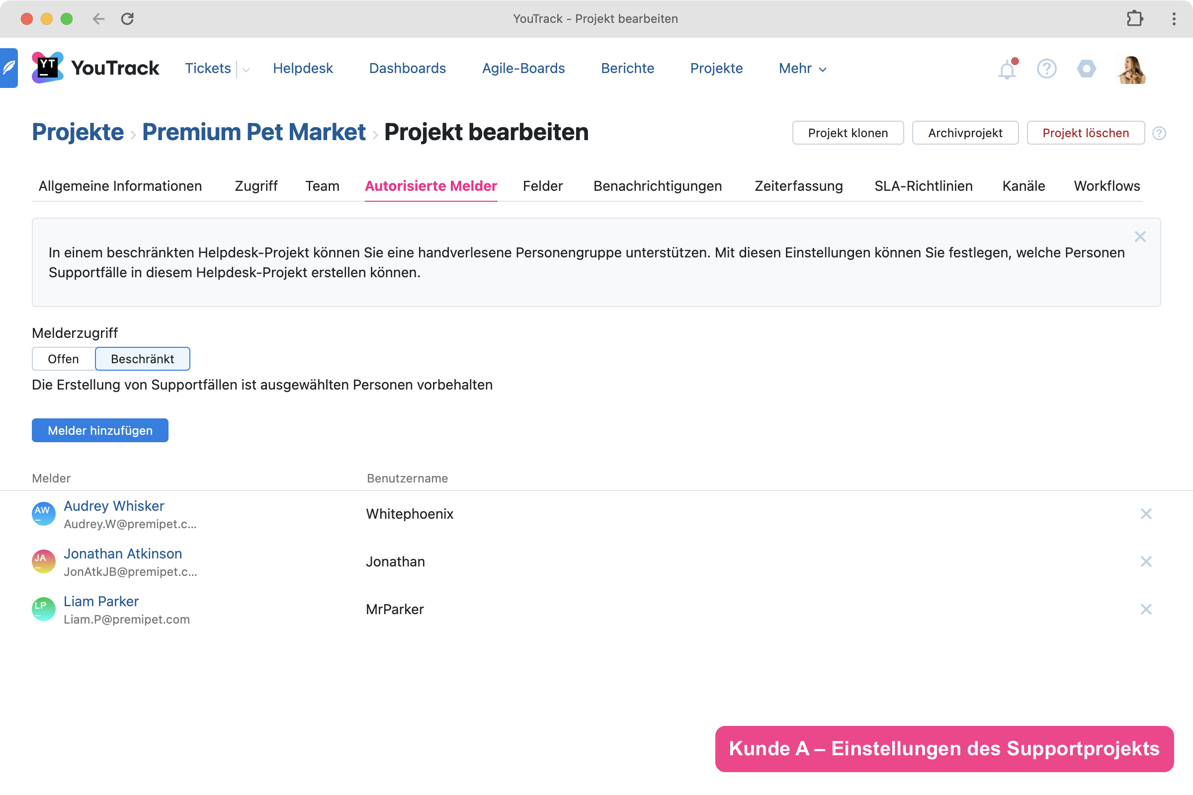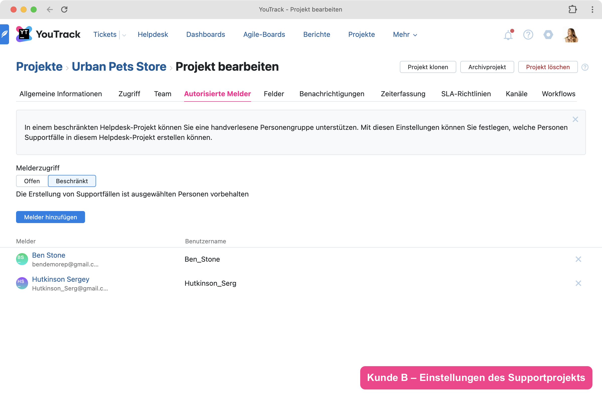 Sie haben jetzt bei jedem Helpdesk-Projekt die Möglichkeit, das Projekt so einzuschränken, dass es nur für einen bestimmten Melderkreis sichtbar ist. Dies bedeutet, dass Ihre Melder*innen aus einem Projekt keinen Zugriff auf Supportfälle, Onlineformulare für die Erstellung eines Supportfalls und Knowledge-Base-Artikel aus anderen Helpdesk-Projekten haben, wenn Sie diese auf eine andere Meldergruppe beschränkt haben. Diese Funktion wurde für Supportteams eingeführt, die innerhalb derselben YouTrack-Instanz mehrere Helpdesk-Projekte verwenden, zum Beispiel für den Support für verschiedene Produkte oder Kundenunternehmen.