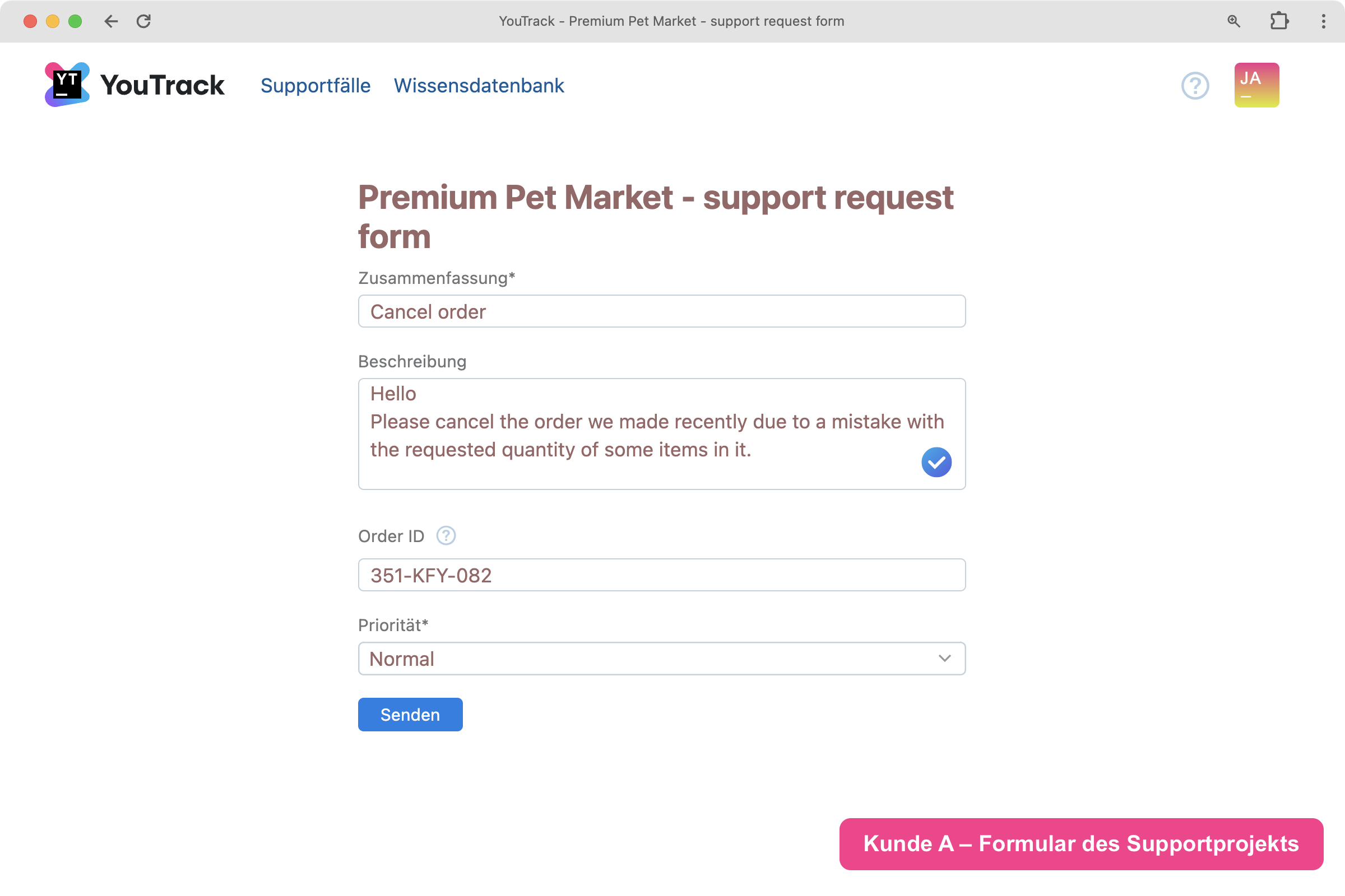 Wenn ein Supportfall in YouTrack erstellt wird, wird anhand des Supportfall-Formulars oder des E-Mail-Betreffs eine Zusammenfassung erstellt. Agent*innen haben jetzt die Möglichkeit, die Supportfall-Zusammenfassung zu bearbeiten, um die Verständlichkeit zu erhöhen und eine spätere Überprüfung zu erleichtern.