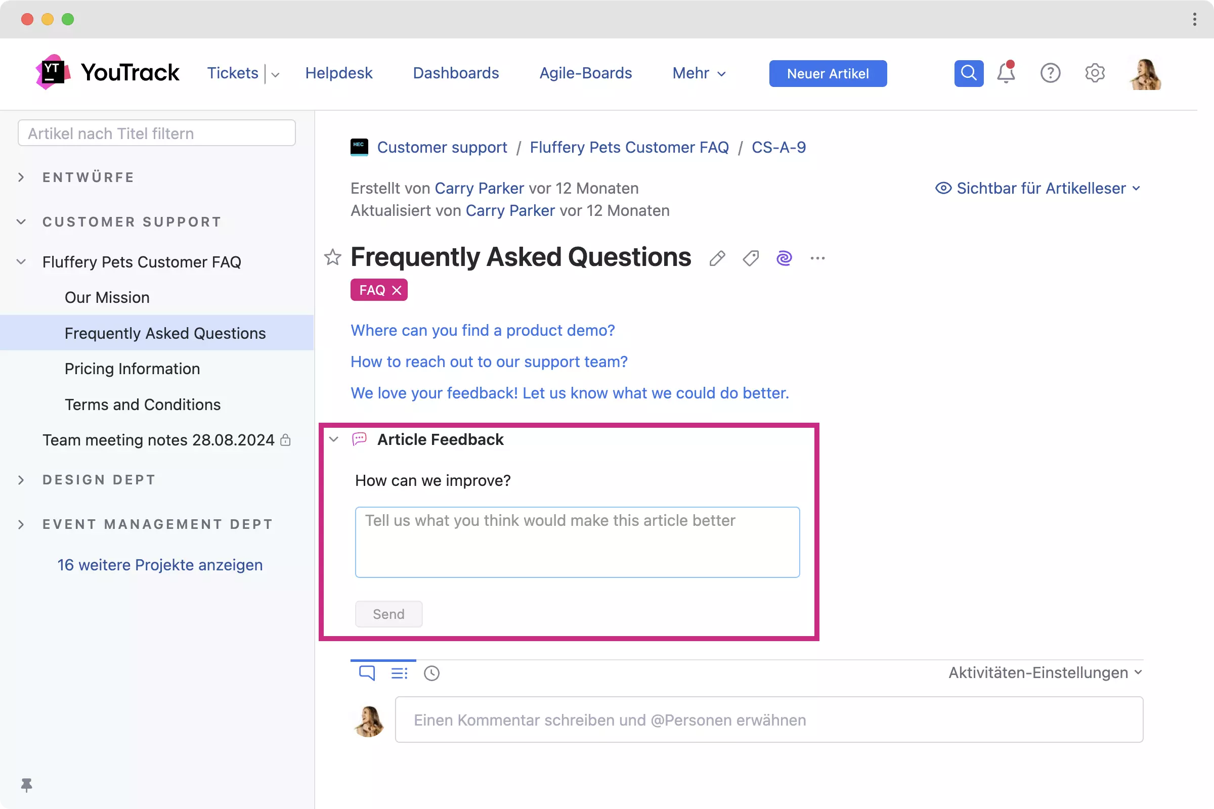 Die App sammelt Feedback zu Artikeln, die in der Knowledge Base veröffentlicht wurden.
