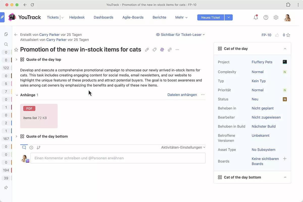 Mit dieser neuen KI-Funktion können Sie unkompliziert neue Aufgaben aus Textinhalten erstellen. Mit einer KI-Aktion wird ein ausgewählter Textabschnitt auf potenzielle Aktionsinhalte untersucht. Im Anschluss wählen Sie die Inhalte aus, die Sie in Tickets konvertieren möchten, um dann alle Tickets in einem Zug zu erstellen. Mit zusätzlichen Optionen können Sie den ausgewählten Text verwenden, um neue Tickets zu erstellen.