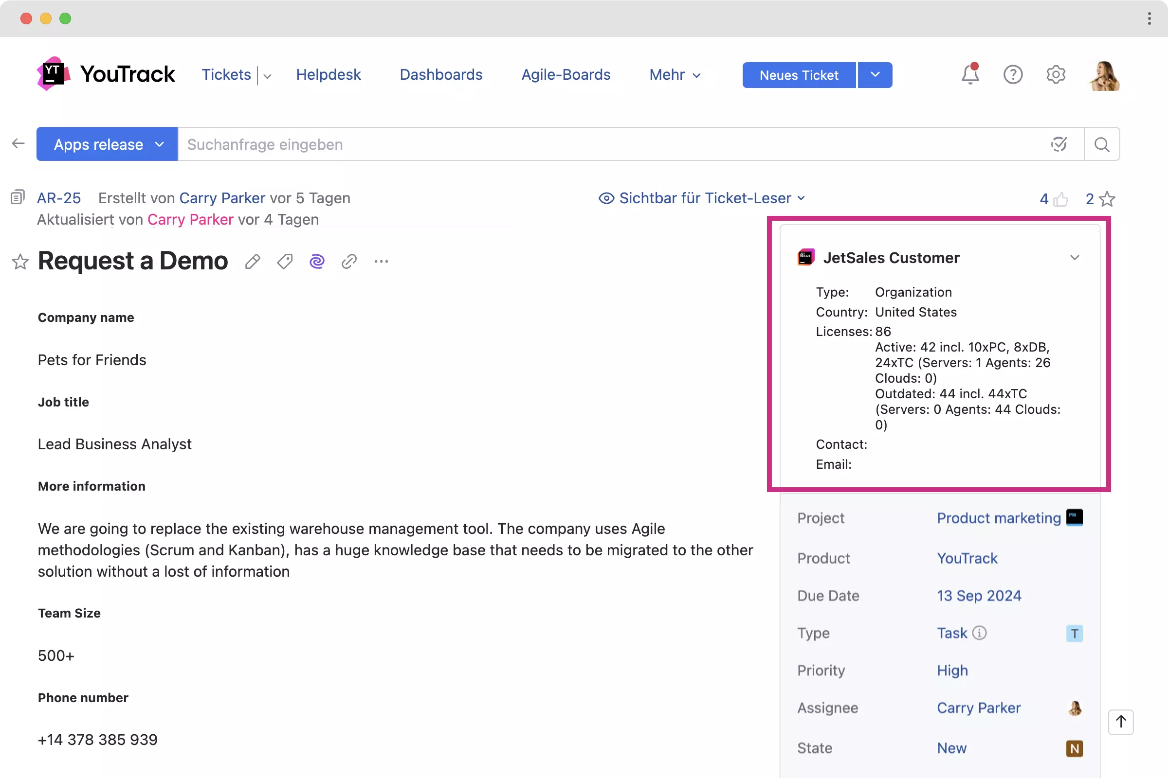Wenn Sie daran interessiert sind, die Möglichkeiten von YouTrack für Ihren Anforderungen im Bereich der Rechtsberatung zu erweitern, nehmen Sie Kontakt mit dem AgiLawyer-Team auf, um im Rahmen einer Vorführung zu erfahren, wie Sie von einer Individualisierung profitieren können.