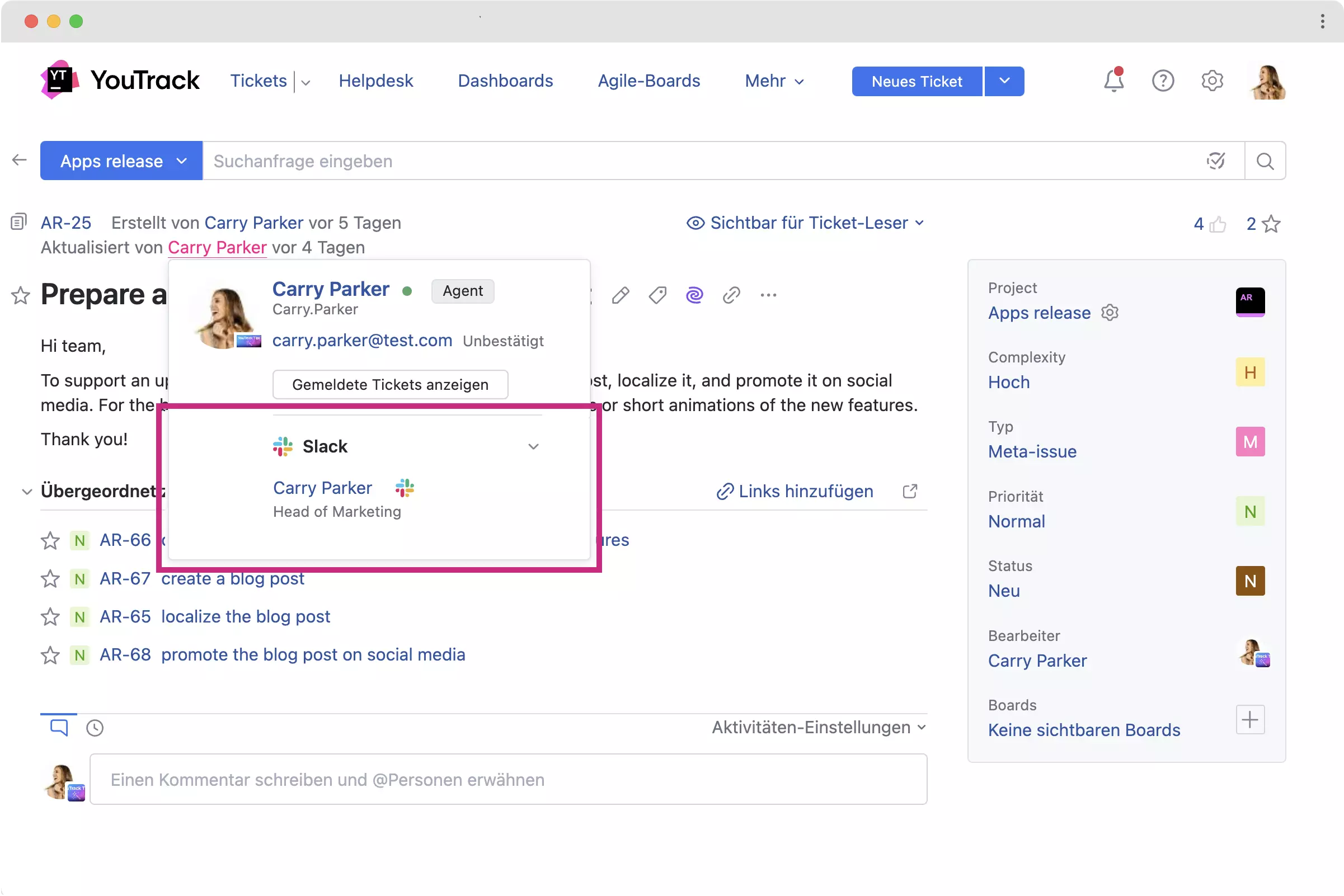 Diese App erweitert YouTrack-Benutzerkarten um Informationen und Statusdaten aus Slack-Profilen.