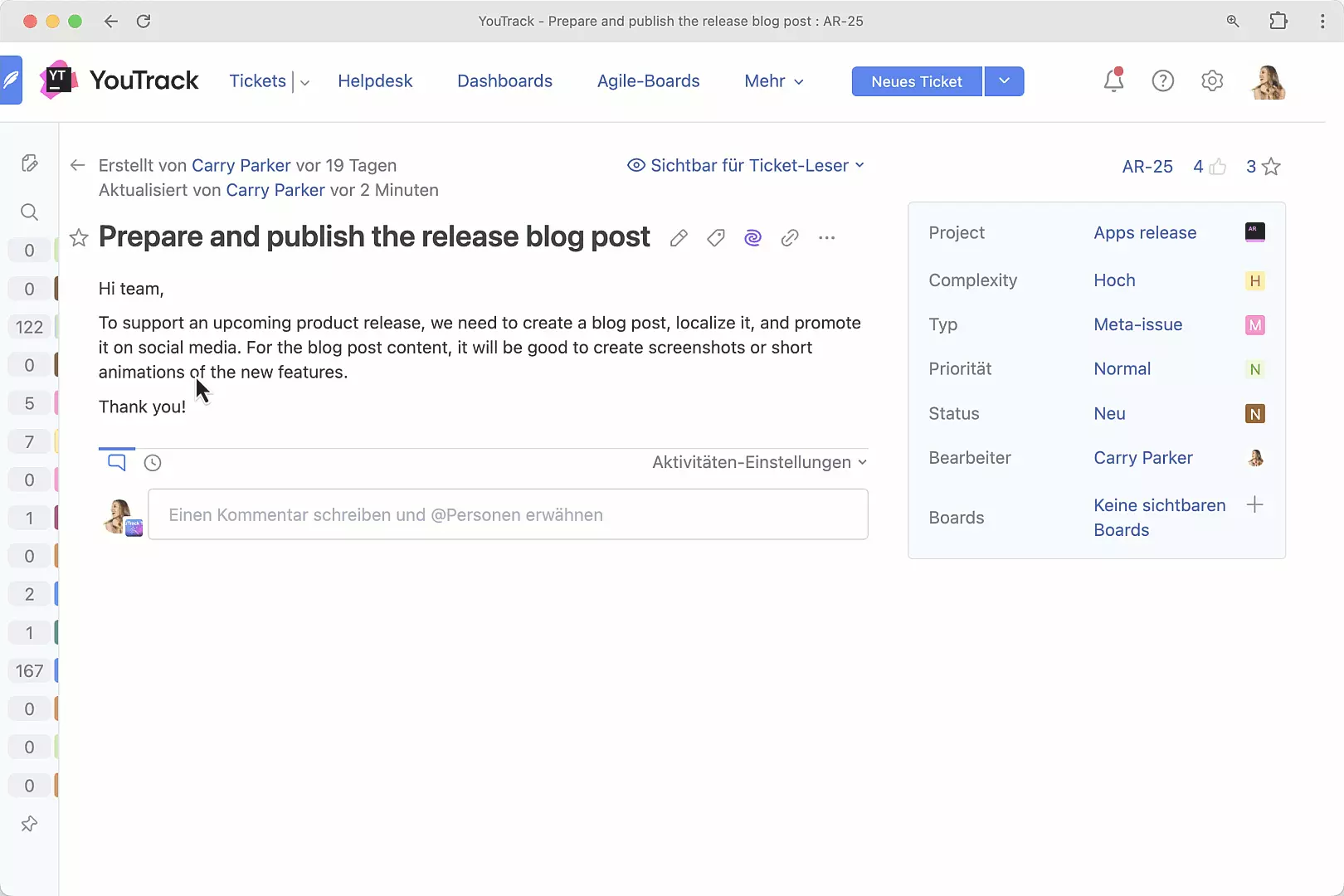 Ab diesem Release können Sie Ihre eigenen Apps erstellen oder externe Apps installieren, um den Workflow Ihres Teams zu unterstützen. Mit Apps können Sie das Erscheinungsbild von YouTrack anpassen, grafische Widgets, Formulare und zusätzliche Seiten hinzufügen, über Workflows komplexe Automatisierungen realisieren und Ihre Arbeitserfahrung verbessern.