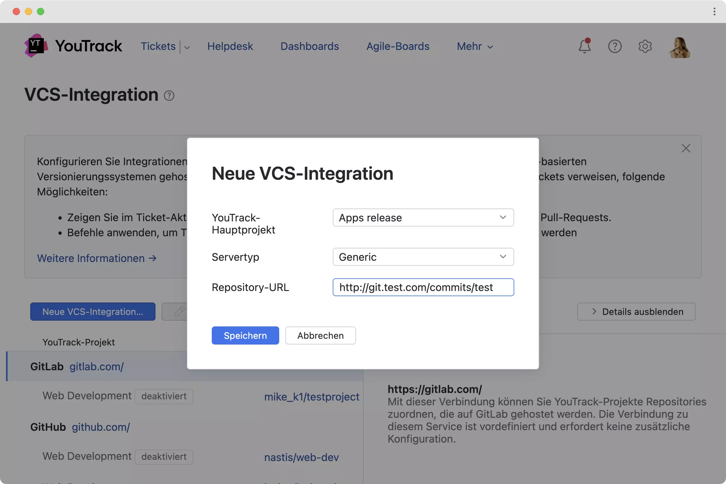 In YouTrack können Sie jetzt Integrationen mit Versionsverwaltungssystemen einrichten, die nicht in unserer Liste der unterstützten Services enthalten sind. Dadurch können Sie Commits manuell an YouTrack-Tickets anhängen oder Links programmatisch über Webhooks hinzufügen.