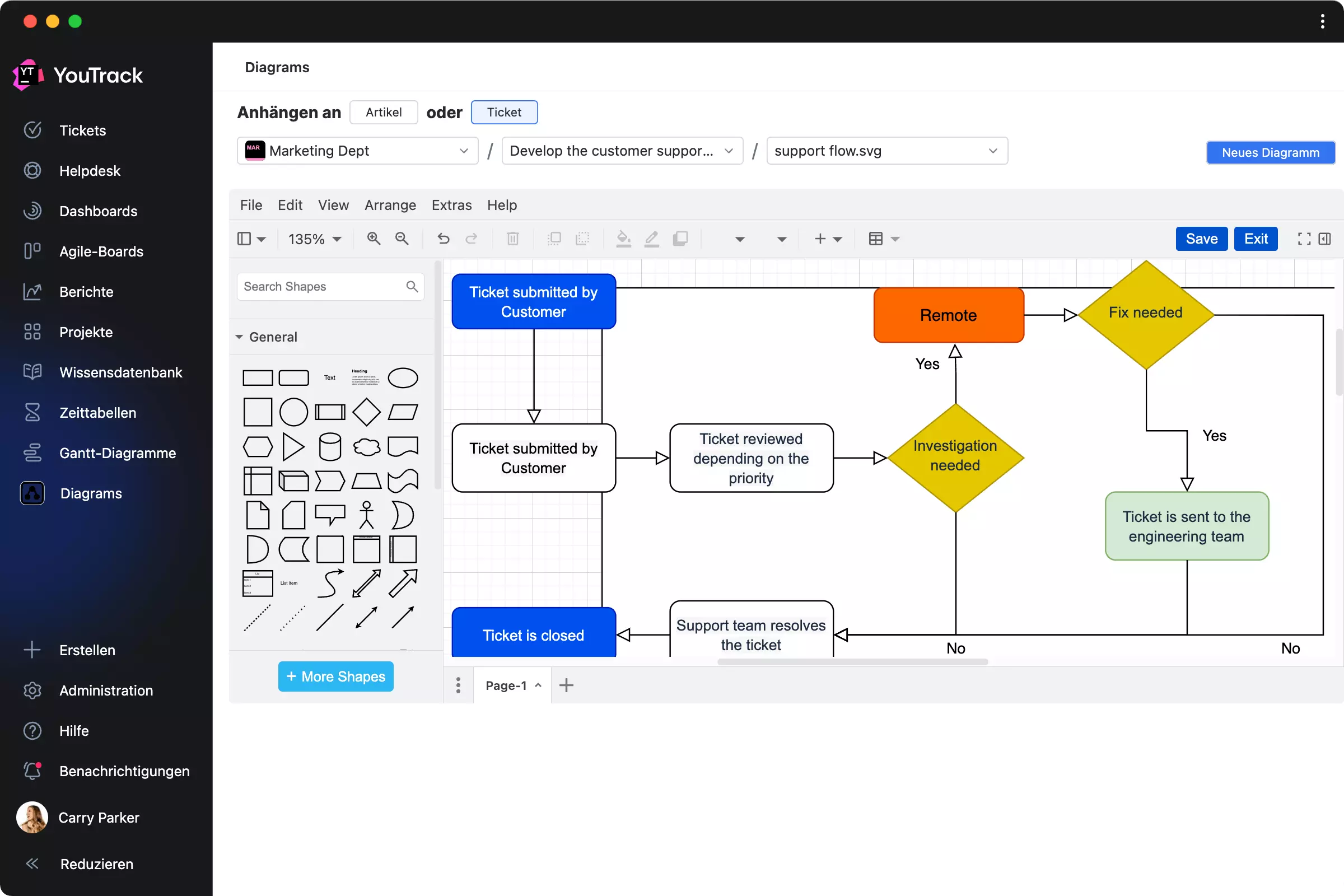 Apps können die Funktionalität von YouTrack erweitern – Sie können mit ihnen sogar völlig neue Seiten erstellen. Diese Seiten lassen sich auch zum YouTrack-Hauptmenü hinzufügen. Mit Diagram Editor zum Beispiel können Teams auf einer speziellen Seite, die auch über die neue linke Seitenleiste zugänglich ist, Diagramme erstellen.