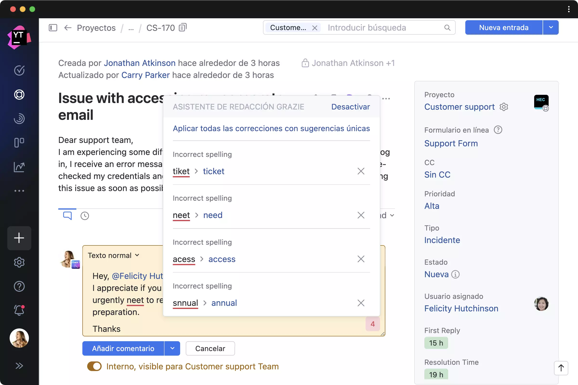 La asistencia a la escritura, con la tecnología de JetBrains AI, le ayuda con la corrección en tiempo real de los textos escritos en inglés o en alemán en todas partes en YouTrack (tareas, artículos, tickets de asistencia y comentarios), ya que comprueba automáticamente la gramática, la ortografía y la puntuación mientras escribe. La funcionalidad de asistencia a la escritura también admite finalización de texto, y le sugiere palabras y frases mientras escribe.