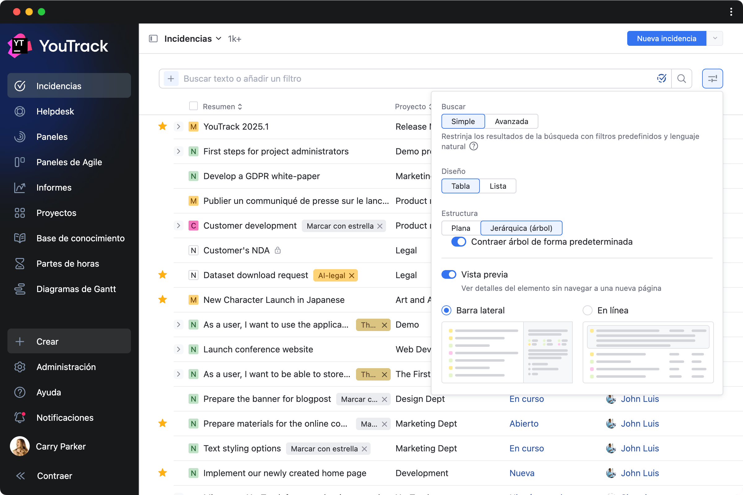 Tiene muchas opciones para elegir a la hora de organizar su espacio de trabajo y las vistas de las tareas. Puede alternar fácilmente entre las vistas de lista y de tabla, personalizándolas con tantos o tan pocos detalles como necesite. Muchos campos pueden editarse directamente en las vistas de las incidencias para ahorrarle tiempo y esfuerzo, y las vistas previas rápidas ayudan a reducir el cambio de contexto. La clasificación y agrupación por varios campos hace que la gestión de grandes listas de tareas sea pan comido.