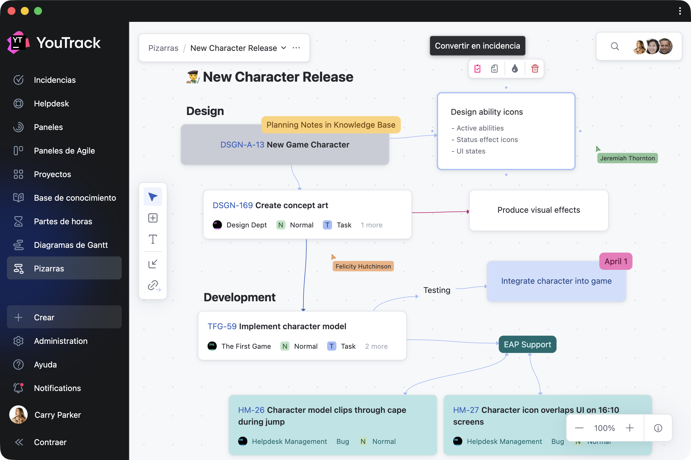 La planificación suele comenzar antes de que el trabajo esté estructurado. Las pizarras de YouTrack le ofrecen un espacio visual flexible para esbozar planes, visualizar el trabajo existente y pensar en los siguientes pasos, de forma independiente o con su equipo. Incorpore incidencias, tickets de asistencia y artículos existentes, o empiece desde cero. Cuando las ideas estén listas, conviértalas en tareas con un solo clic, con las dependencias sincronizadas de forma automática.