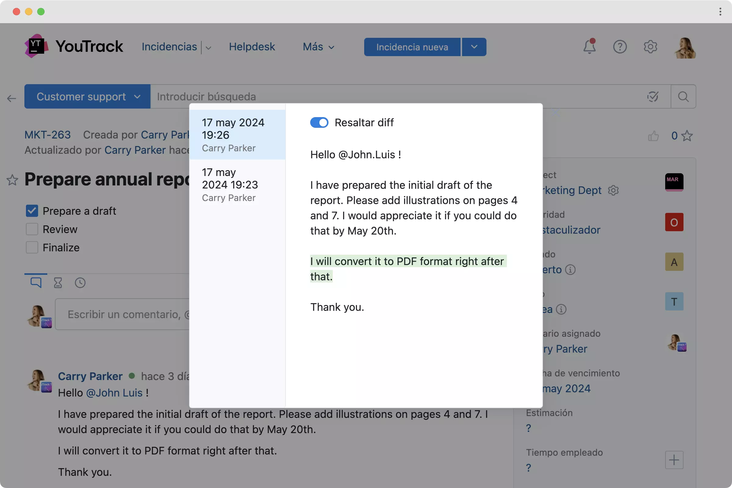 Ahora, puede revisar el historial completo de los cambios hechos en las descripciones de incidencias, los artículos y los comentarios. Gracias a esta transparencia, podrá saber quién hizo cada cambio y cuándo se hizo. Si el cambio se realizó por error o debe revertirse, puede restaurar una versión anterior en cualquier momento.