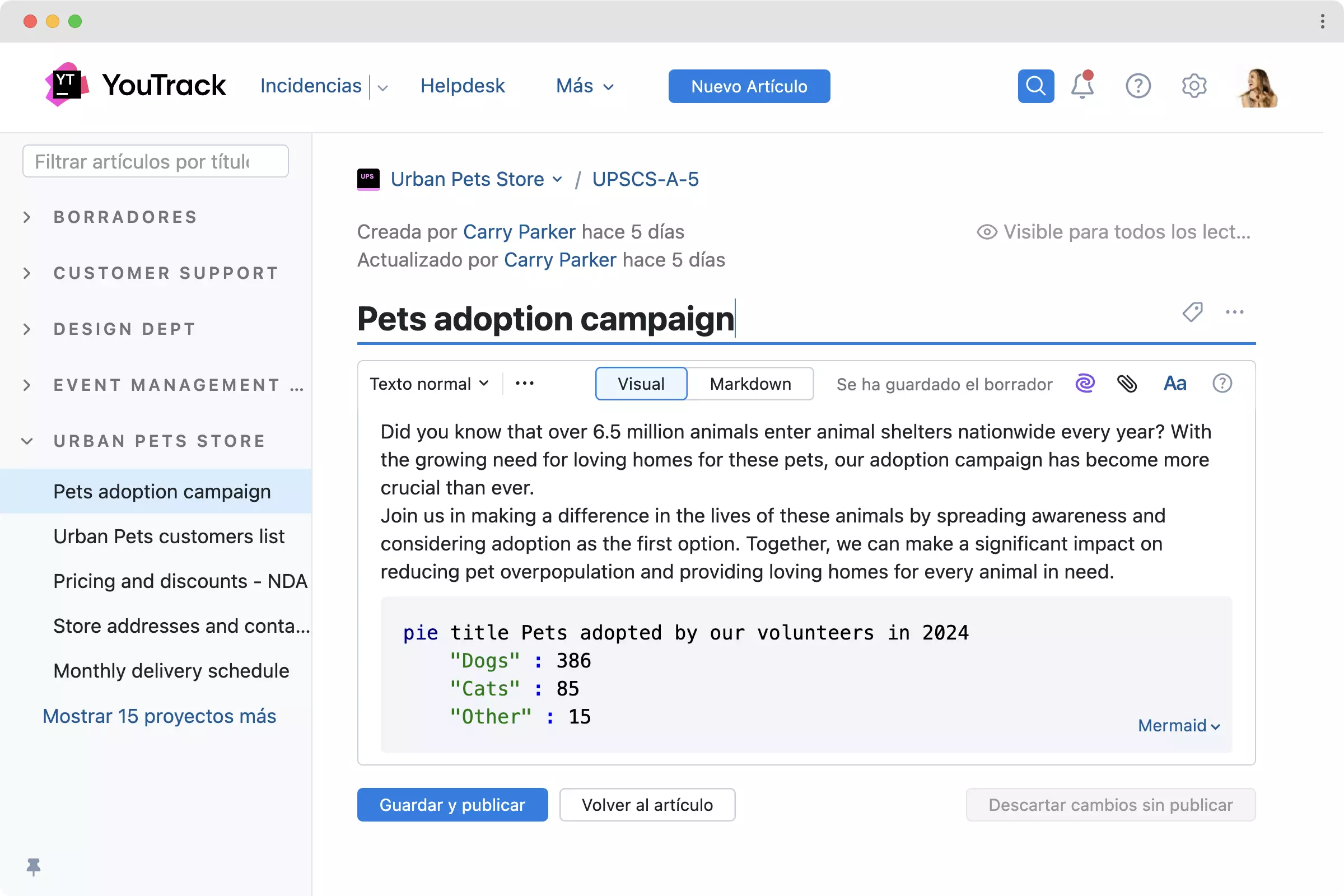 Ahora, YouTrack es compatible con diagramas y gráficos creados con marcado Mermaid. Puede añadirlos a sus tareas o artículos y compartirlos en los comentarios, incluso en comentarios integrados en una base de conocimiento. Solo tiene que incrustar un bloque de código para el diagrama y se visualizará de forma automática.