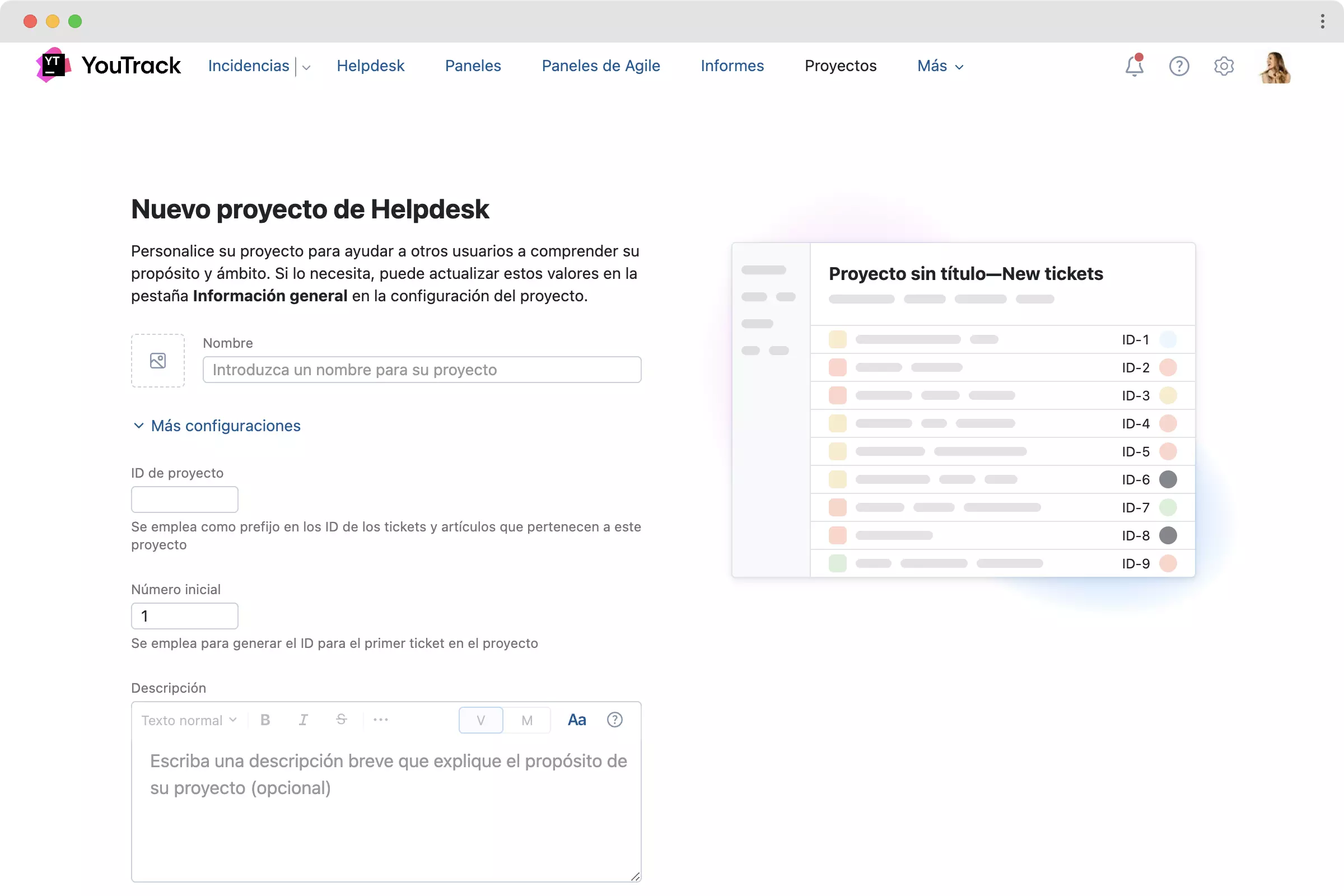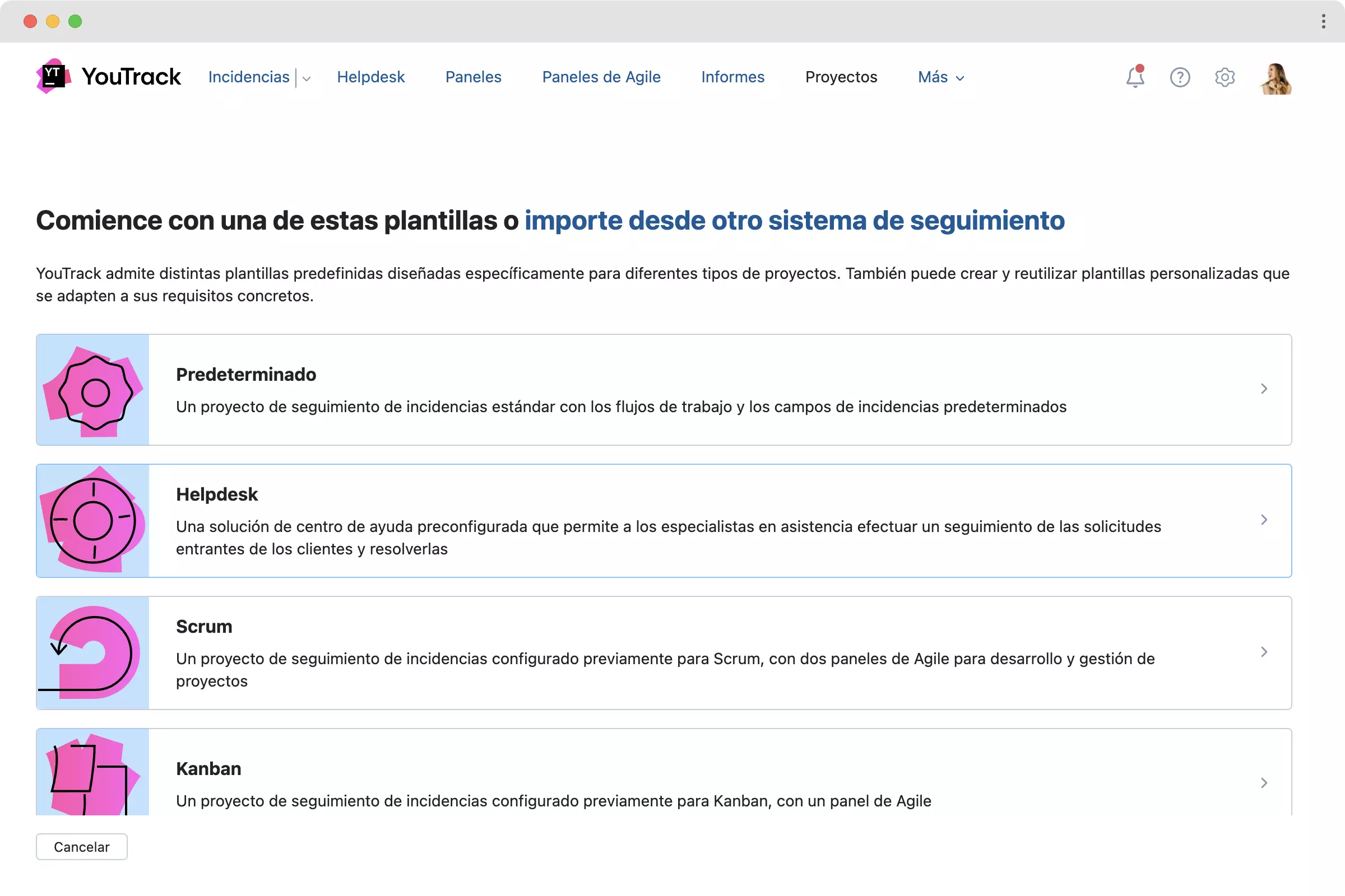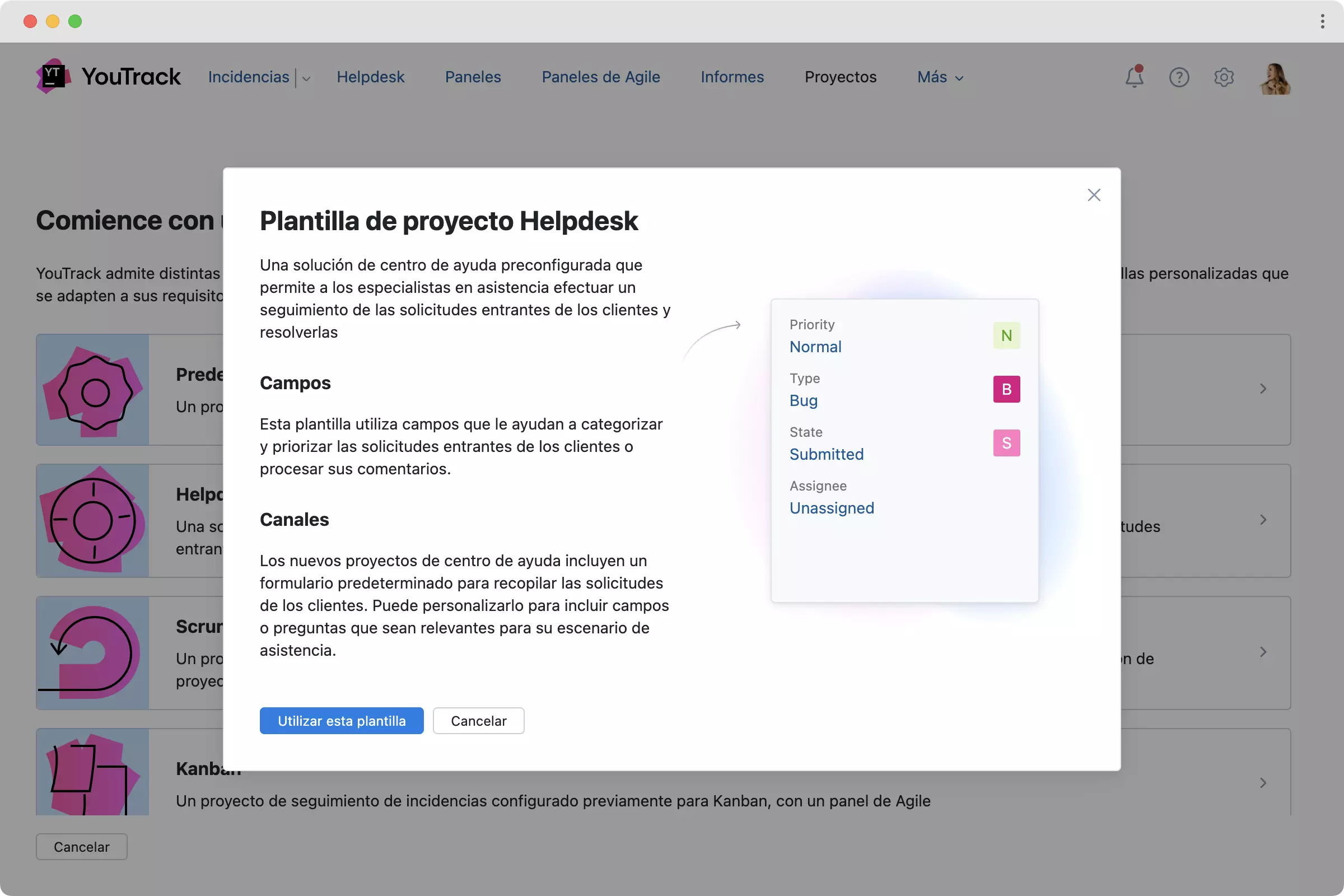 Hemos actualizado el asistente de proyecto en YouTrack para que los gestores de proyectos puedan navegar a través del proceso de creación de proyectos más fácilmente. Puede elegir entre las plantillas, navegar por todos los pasos para personalizar sus proyectos y tareas según las necesidades de su equipo, invitar a los miembros del equipo, y mucho más.