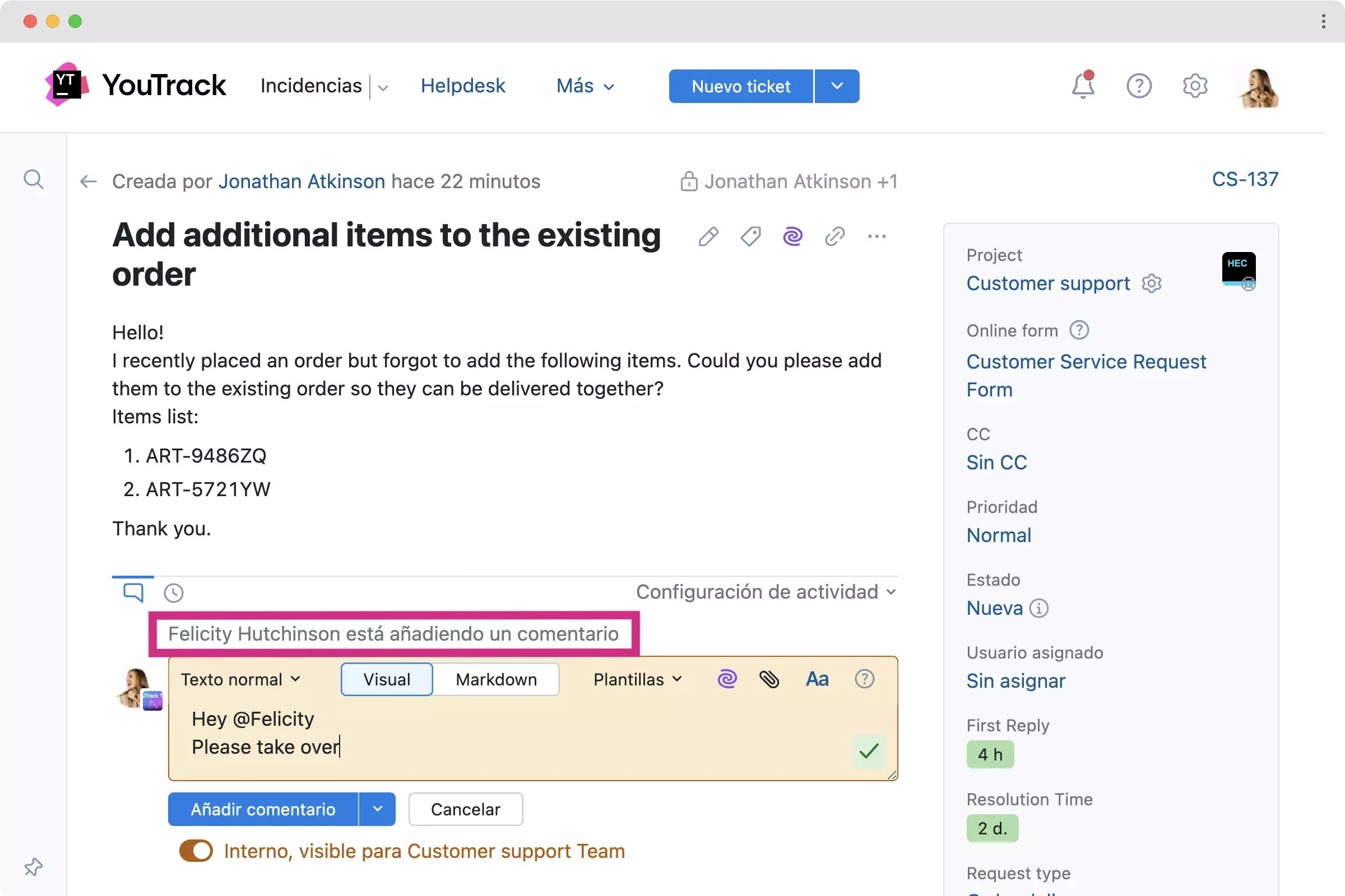 Ahora, los agentes de asistencia y los miembros de su equipo pueden ver cuándo otros agentes o miembros del equipo están añadiendo un comentario a un ticket, lo cual ayuda a no duplicar esfuerzos.