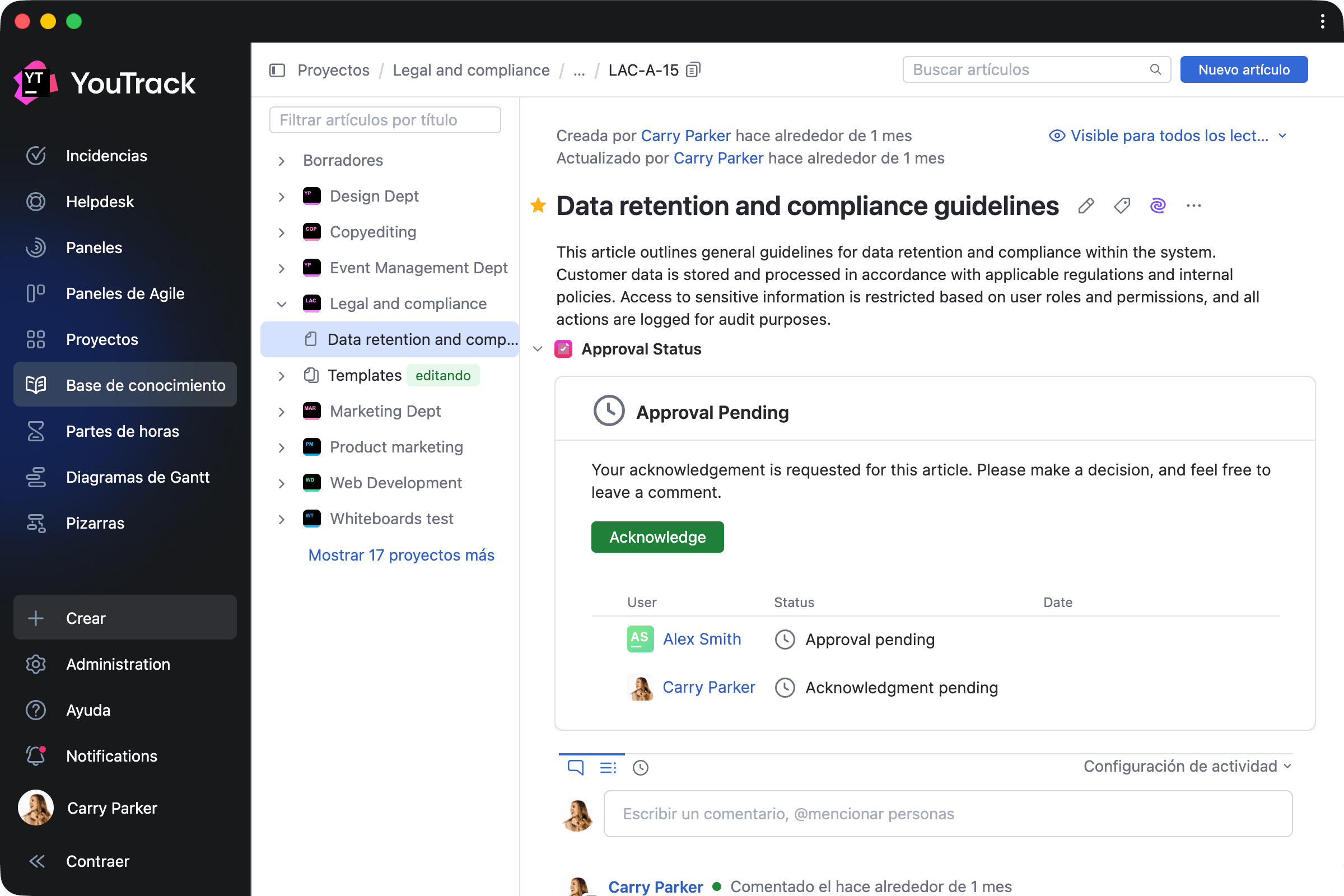 Esta aplicación de pago permite a los equipos gestionar flujos de aprobación directamente en la base de conocimiento. Puede invitar a aprobadores y revisores para cada artículo, establecer fechas de vencimiento y hacer un seguimiento de los estados de aprobación.