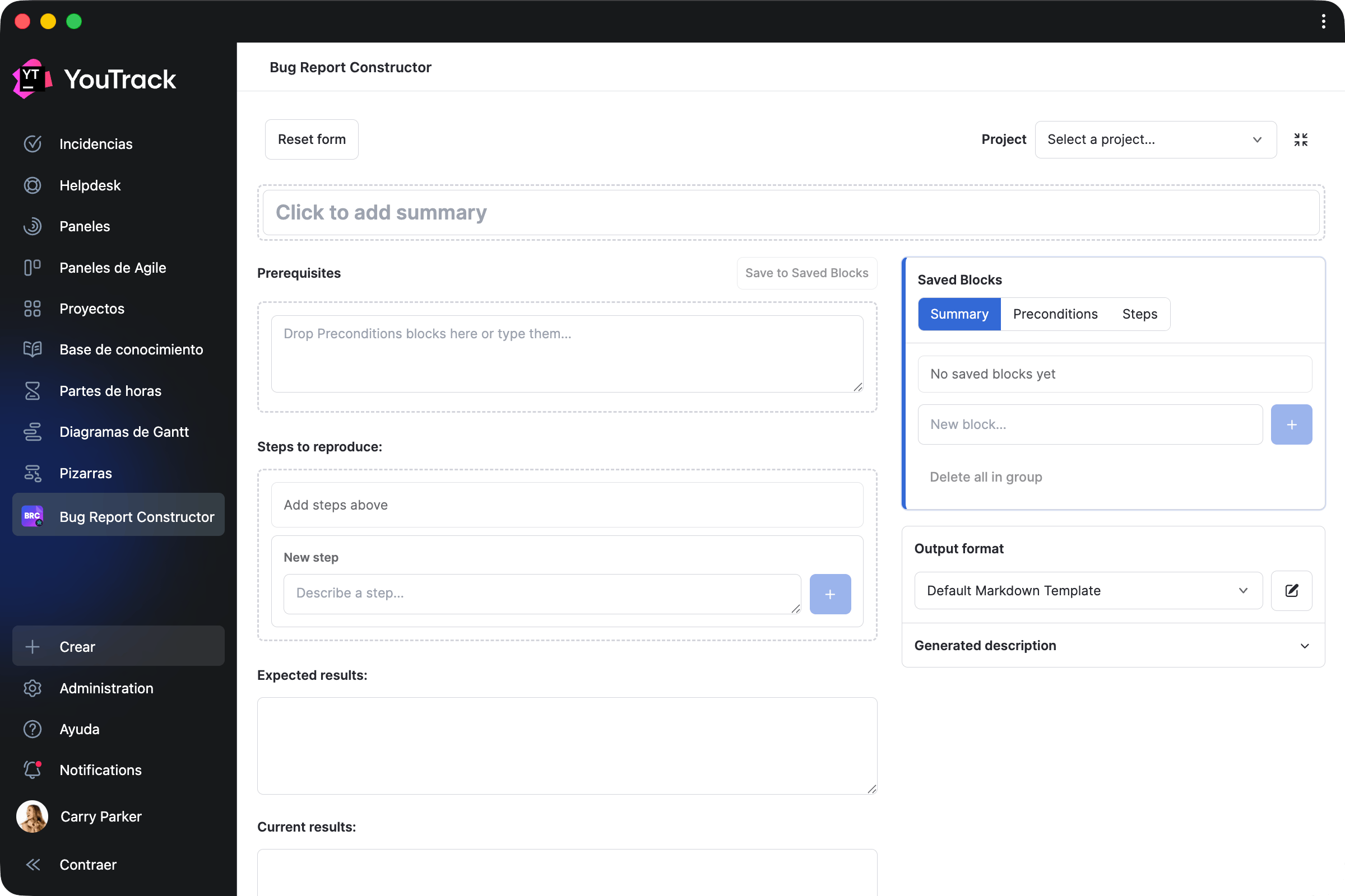 Esta aplicación permite a los equipos de control de calidad recopilar informes de errores utilizando una plantilla única y crear rápidamente borradores de tareas con bloques preguardados.