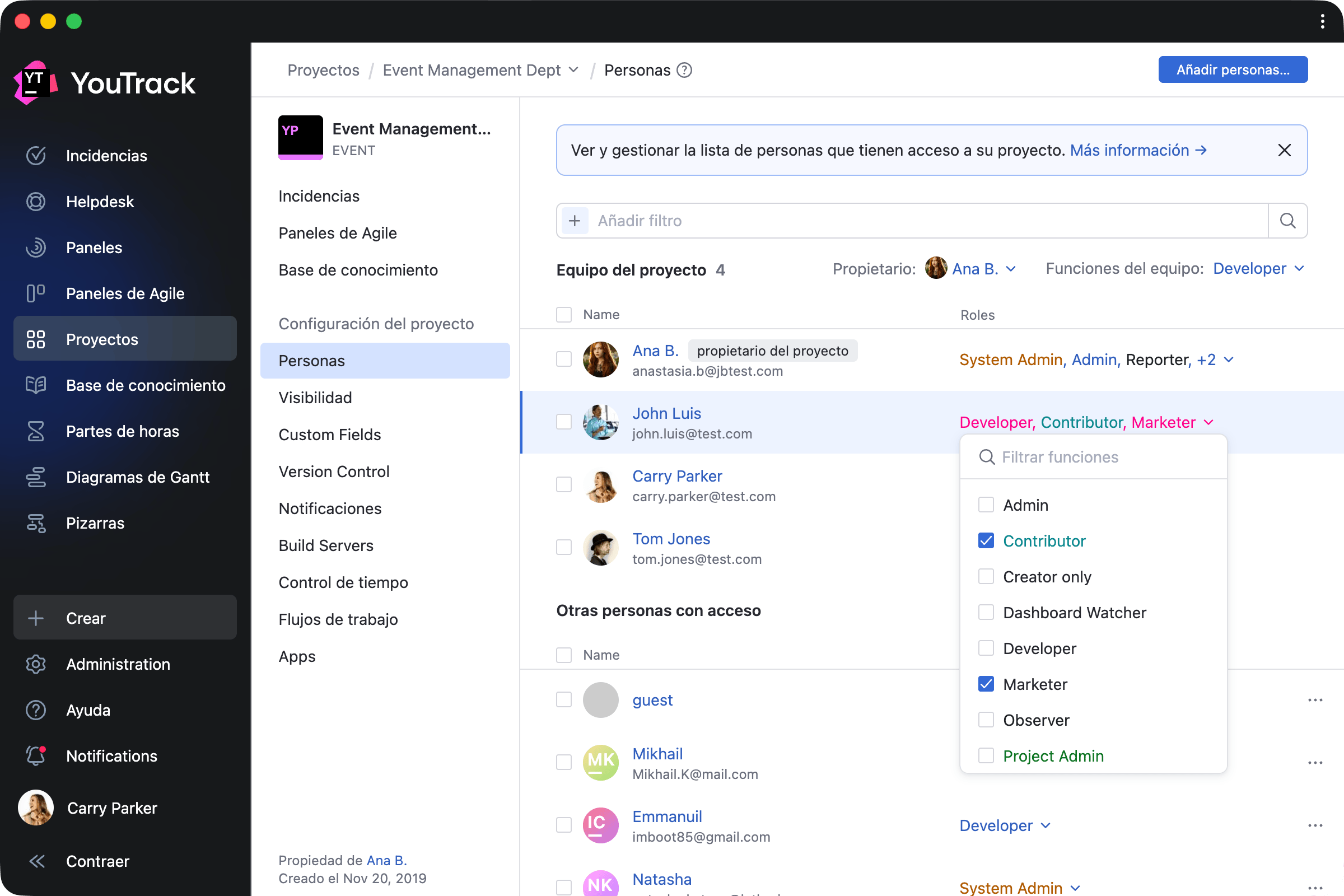La gestión del acceso a proyectos ahora es más sencilla. Desde la nueva pestaña Personas en la página de resumen del proyecto, los administradores pueden añadir o eliminar usuarios y grupos, asignar roles y filtrar miembros del equipo por permisos, todo sin tener que cambiar de página.