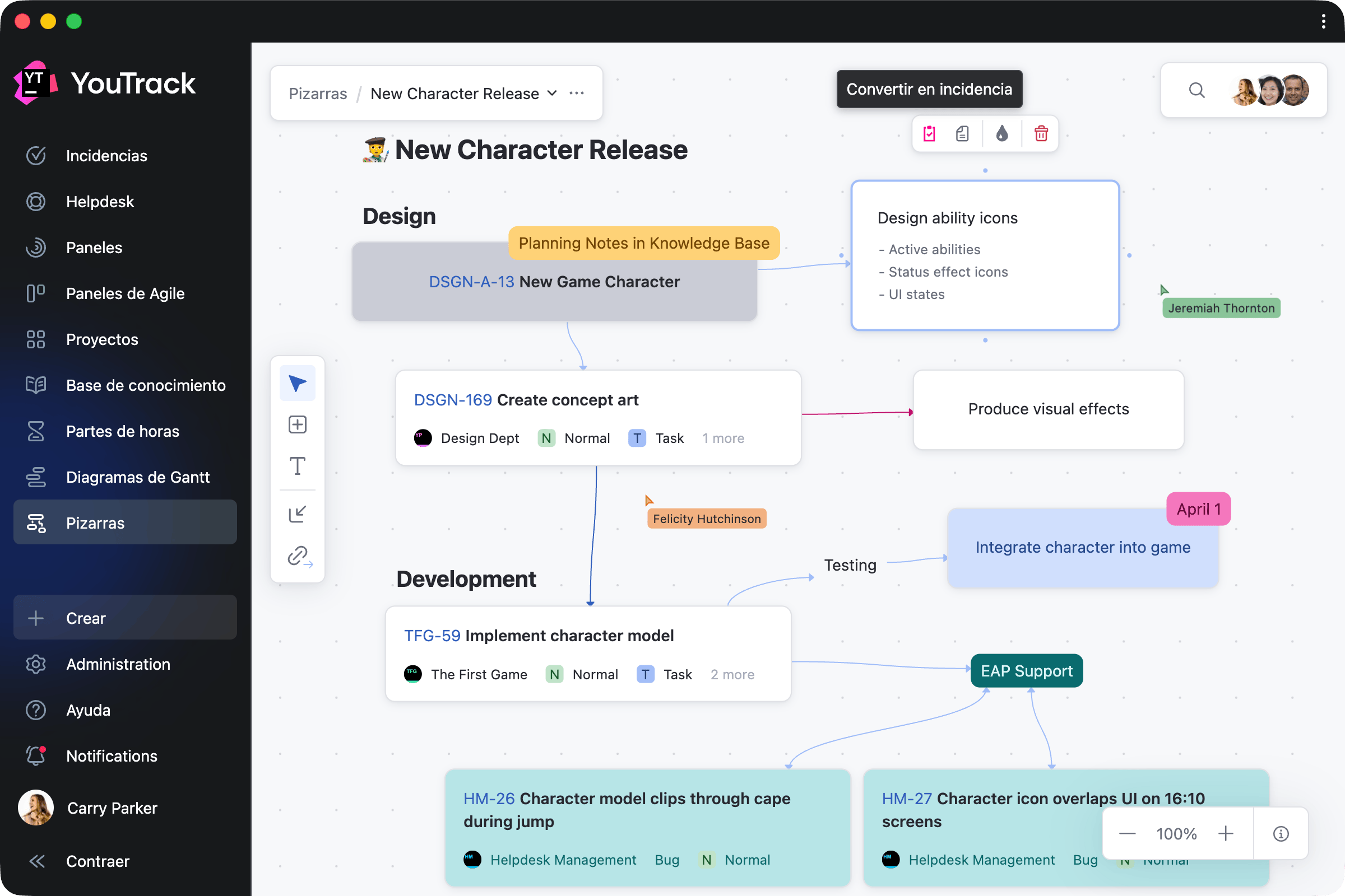 Las pizarras aportan un nuevo espacio flexible para que los equipos planifiquen, generen ideas y colaboren de manera eficaz. Conecte sus proyectos actuales para organizar y visualizar mejor el trabajo, o añada notas y conviértalas en tareas y artículos cuando esté listo. Esto permite a los gestores de proyectos y a los equipos planificar desde cero, colaborar en proyectos en curso y garantizar que cada actividad esté vinculada a su trabajo en YouTrack.