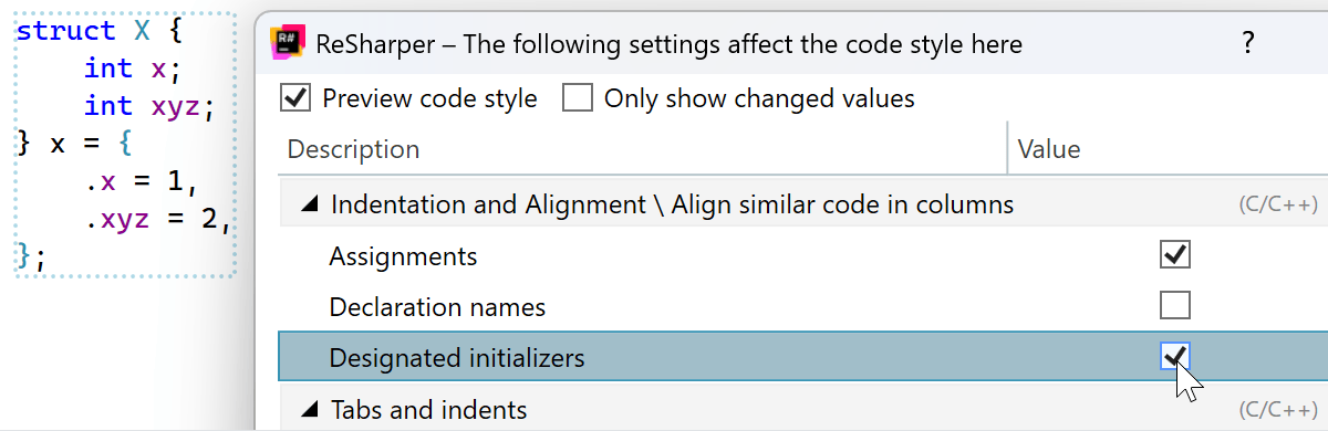 Un nouveau paramètre de mise en forme permet d'aligner les initialiseurs désignés en colonnes.