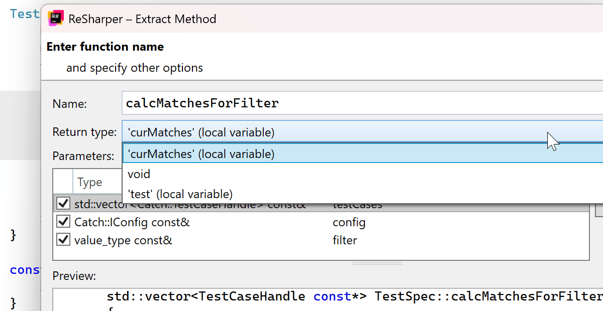 La refactorisation Extract Method vous permet à présent de choisir une variable locale à renvoyer par la fonction nouvellement créée. Nous avons également amélioré les performances du volet d'aperçu dans la boîte de dialogue Change Signature, en particulier dans les fichiers comportant de nombreuses inclusions.