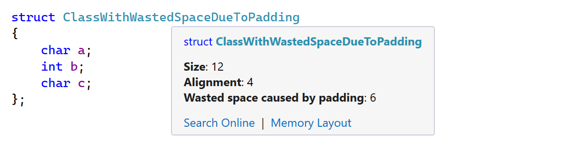 Quick Info affiche désormais la quantité totale de marge intérieure d'une classe, en plus de sa taille et de son alignement, ce qui vous aide à optimiser la disposition en mémoire de vos objets.