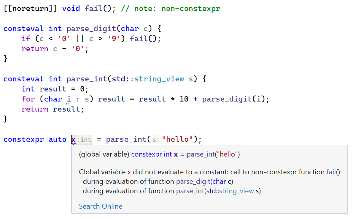 Dans cette version, nous avons résolu de nombreux problèmes dans le moteur d'évaluation constexpr. Ces améliorations, ainsi que les précédentes, ont permis la mise en place d'une nouvelle inspection qui détecte les échecs d'évaluation de constexpr et présente une trace d'évaluation complète pour vous aider à diagnostiquer plus facilement ce problème.