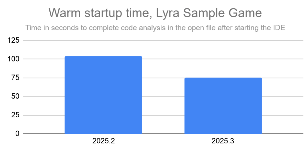 ReSharper C++ 2025.3 accélère considérablement le démarrage à chaud dans les projets Unreal Engine, grâce à des optimisations dans l'initialisation du projet et l'analyse des ressources. Lors de nos tests, l'analyse du code du fichier actif s'effectue jusqu'à 30 % plus rapidement après le démarrage de l'IDE. Mais ce n'est pas tout : vous pouvez désormais commencer vos modifications immédiatement ; il n'est plus nécessaire d'attendre la fin de l'indexation de tous les fichiers de ressources après l'ouverture d'une solution.