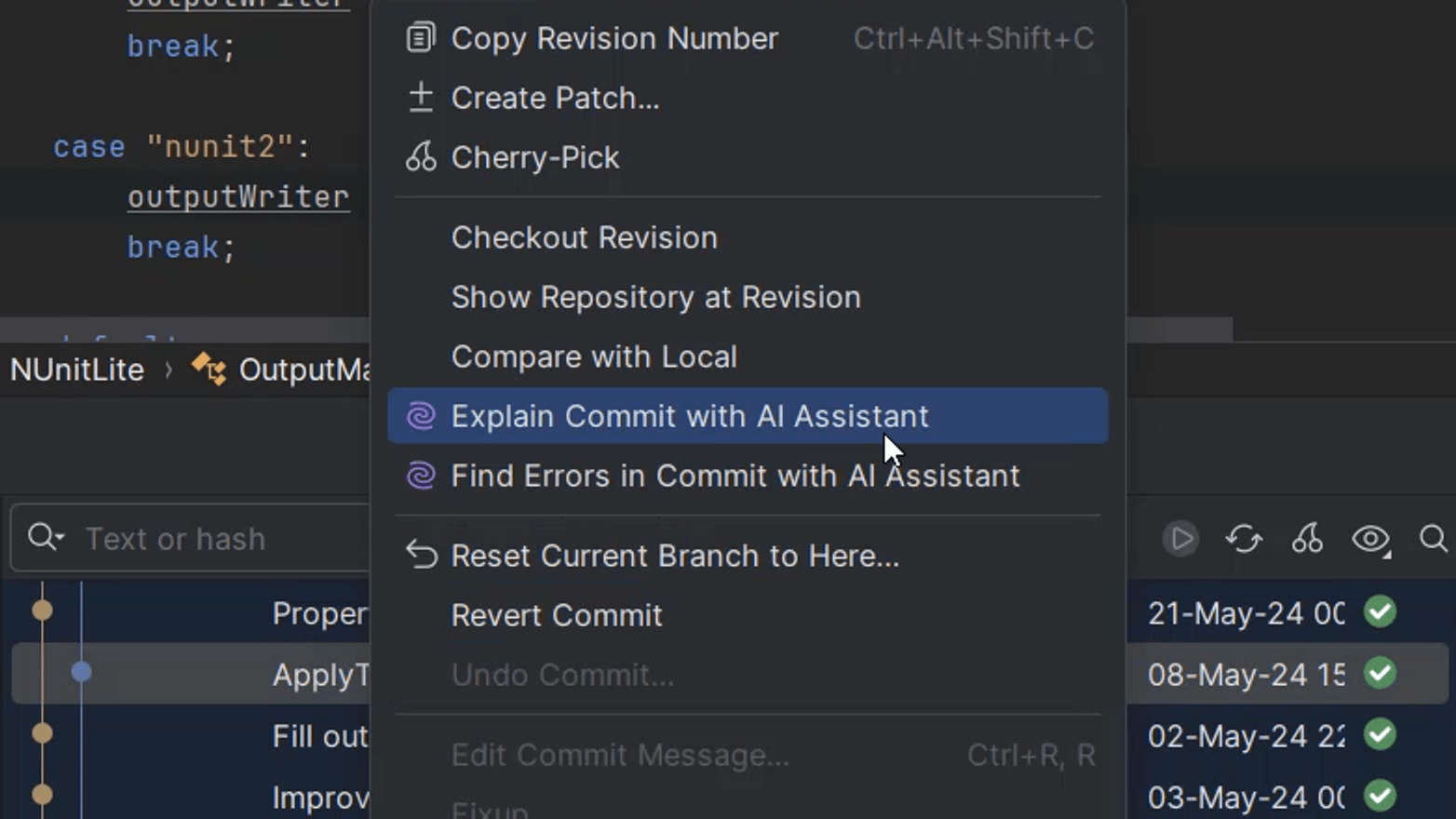Lorsque votre code lève une exception ou que votre historique Git devient compliqué, l'AI Assistant est là pour le décomposer. Il explique les exceptions et déchiffre les historiques de commit pour faciliter le dépannage et le contrôle de votre code. Fini les devinettes : vous obtenez uniquement des informations claires et exploitables.