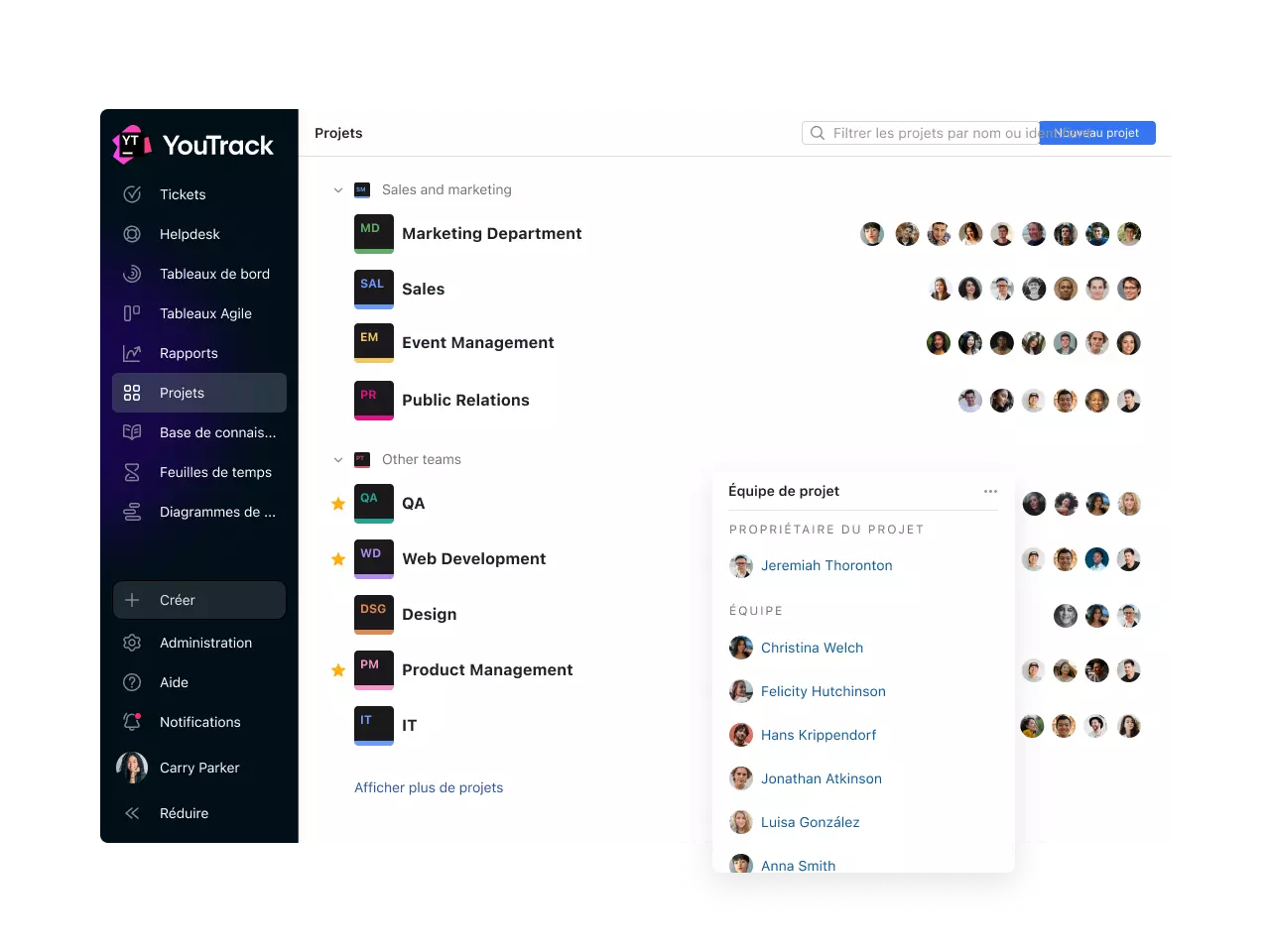 YouTrack est un outil de gestion de projet doté de fonctionnalités qui simplifient votre travail et augmentent votre productivité sur tous les types de projets d'équipe. Du développement de logiciels et DevOps aux RH et au marketing, toutes les équipes peuvent utiliser les fonctionnalités de YouTrack pour suivre leurs projets quelle qu'en soit la taille et collaborer facilement.