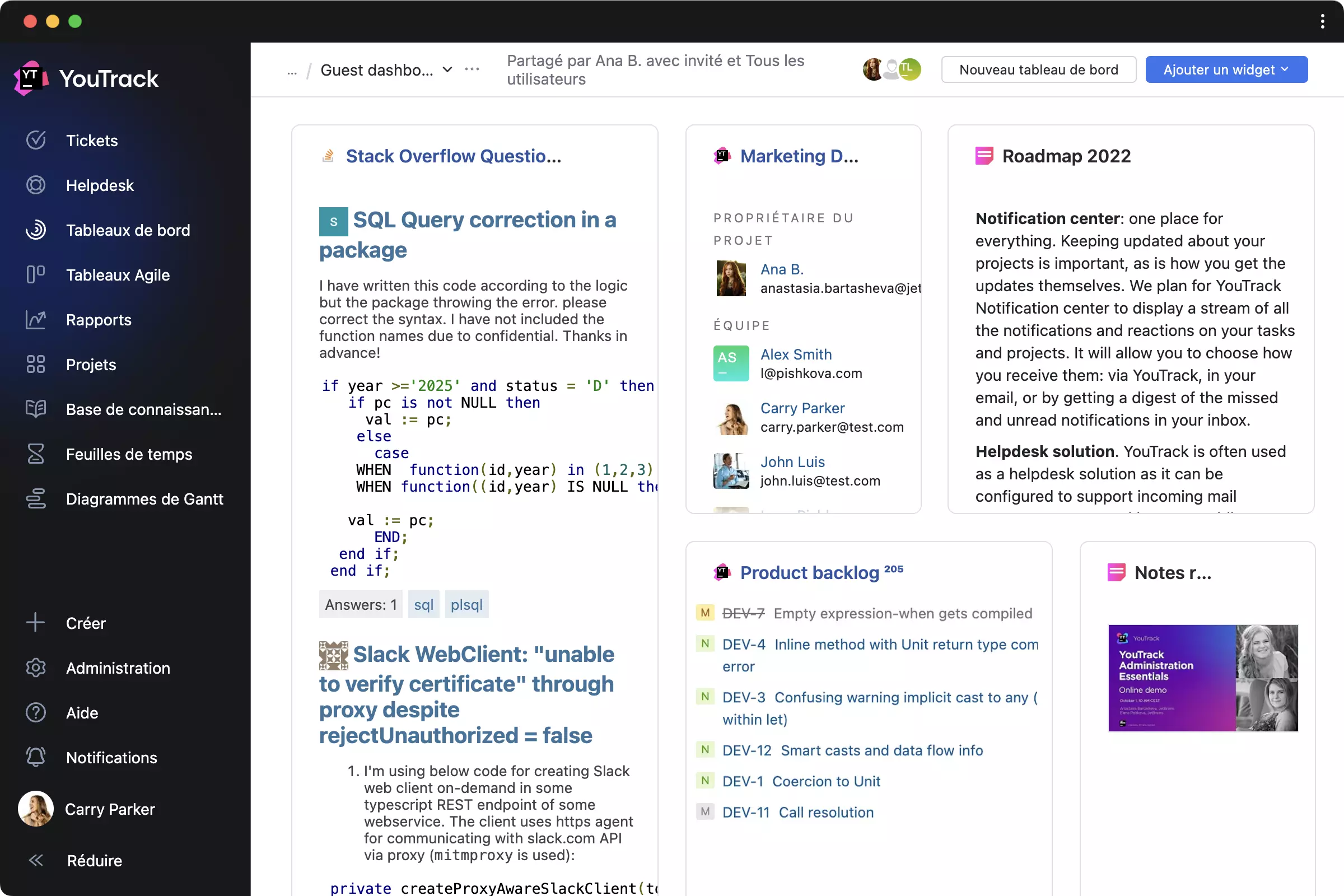 Les tableaux de bord d'invités, avec des listes de tickets filtrées et des widgets de texte formaté, donnent à vos clients un aperçu de vos activités actuelles et de vos projets pour les prochaines itérations.
