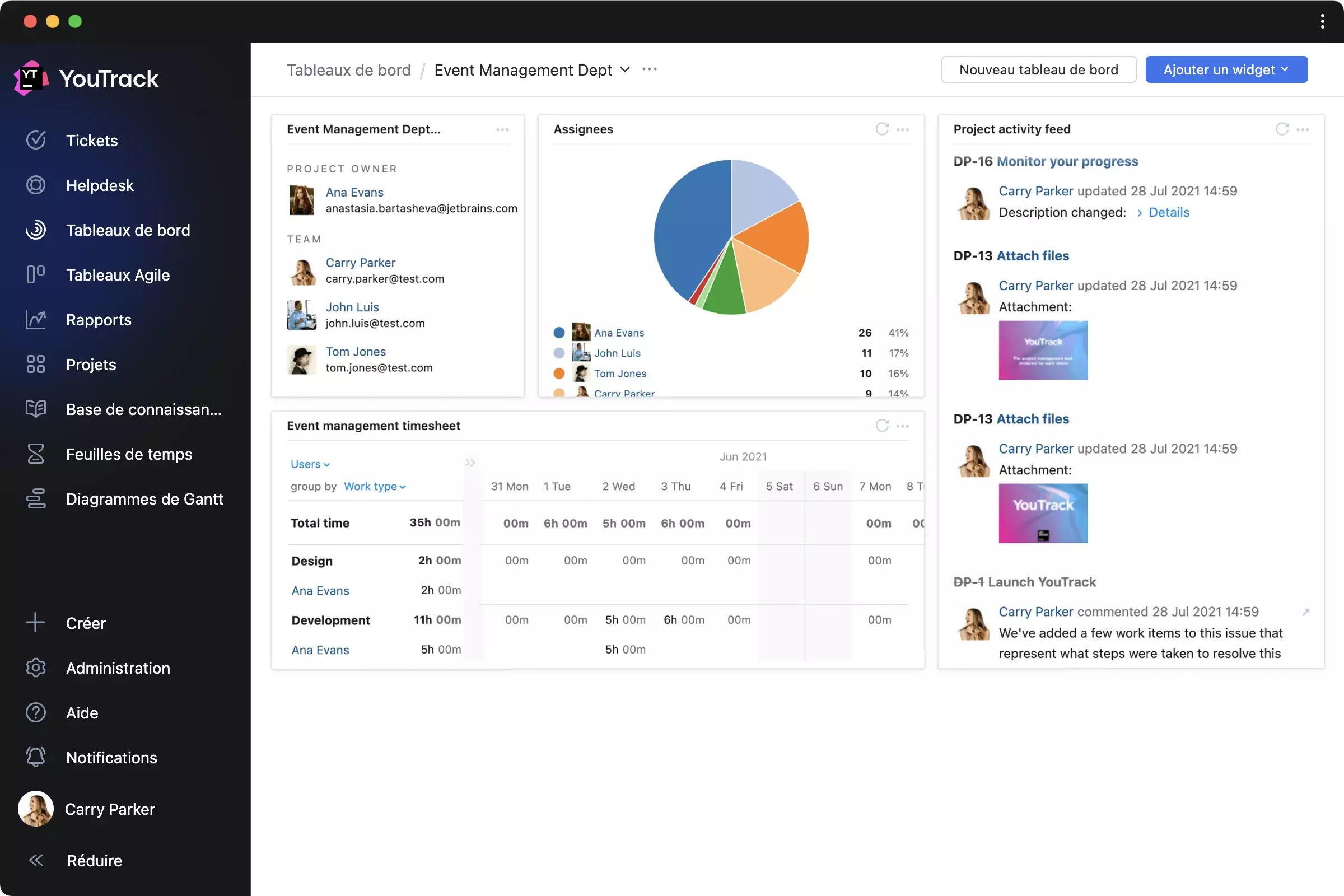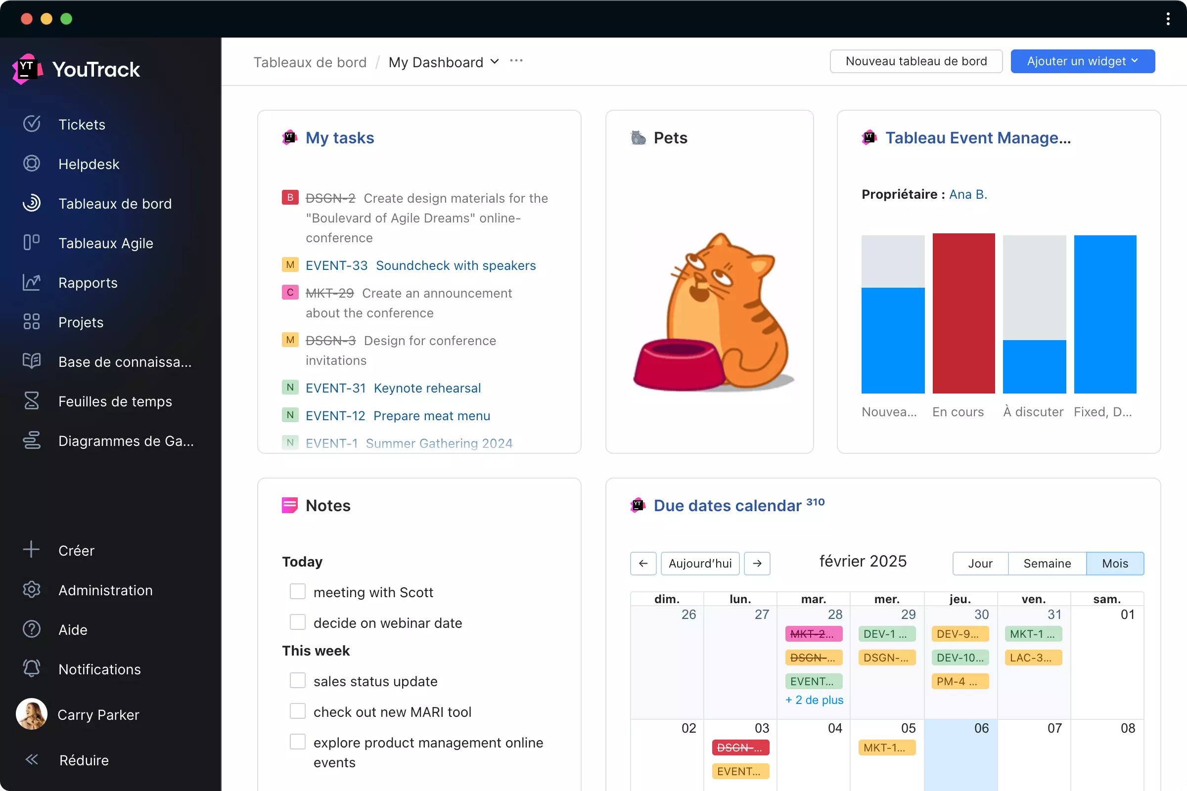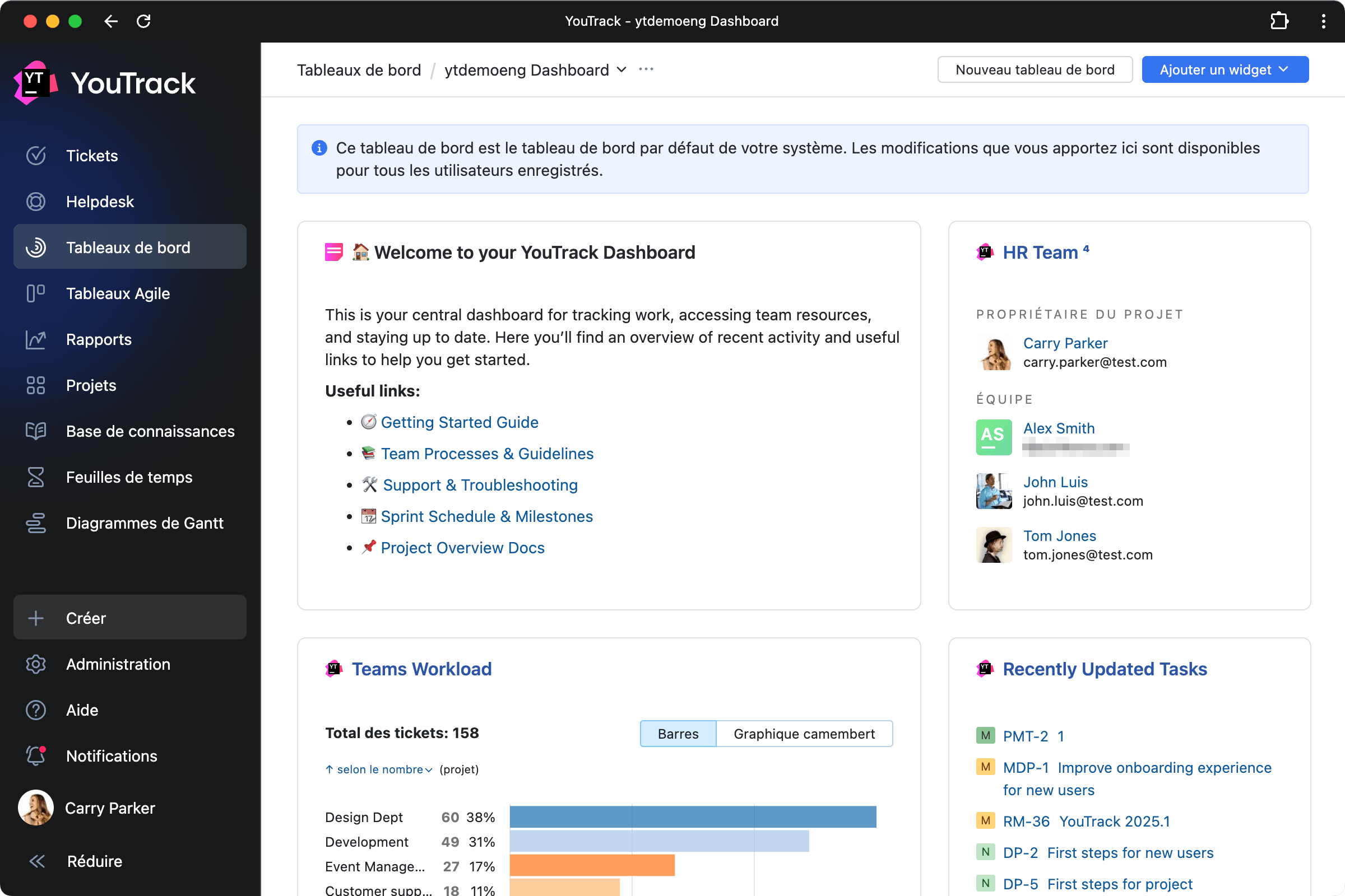 Chaque membre de l'équipe peut créer des tableaux de bord personnels avec son propre backlog de tâches, ses rappels, des raccourcis utiles et d'autres informations.