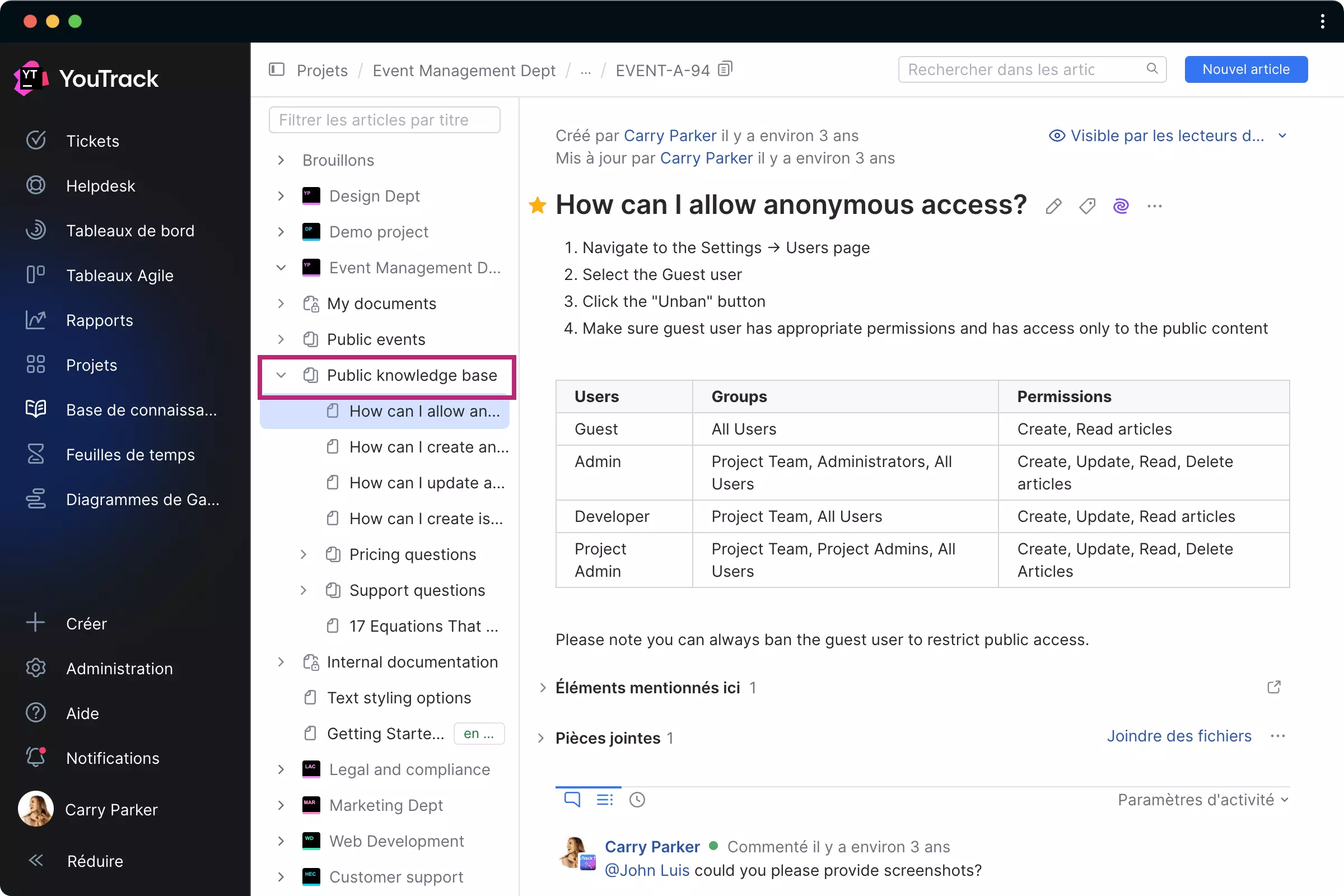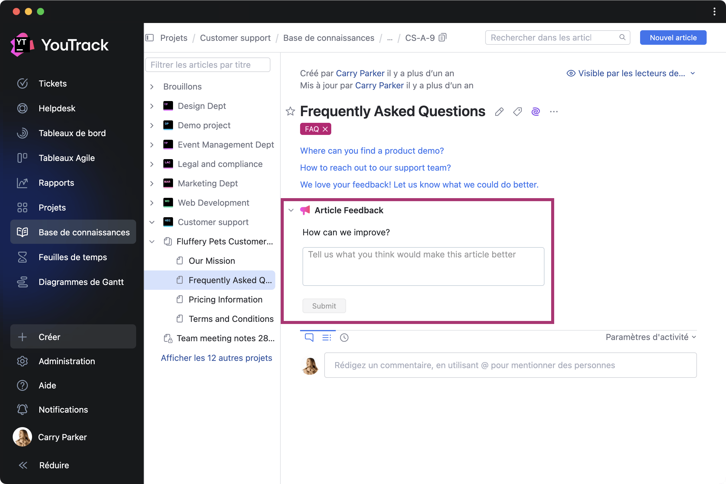 Configurez une section publique de votre base de connaissances afin que les visiteurs ainsi que les moteurs de recherche puissent parcourir et trouver des articles et des FAQ sur votre produit sans s'enregistrer sur YouTrack. Des filtres puissants, des balises et une recherche en texte intégral permettent à vos clients de trouver facilement ce qu’ils cherchent, et les commentaires sur les articles aident les personnes enregistrées à obtenir des réponses à leurs questions. Lorsque vous souhaitez recueillir des commentaires, utilisez l'application Article Feedback pour savoir ce que pensent vos clients.