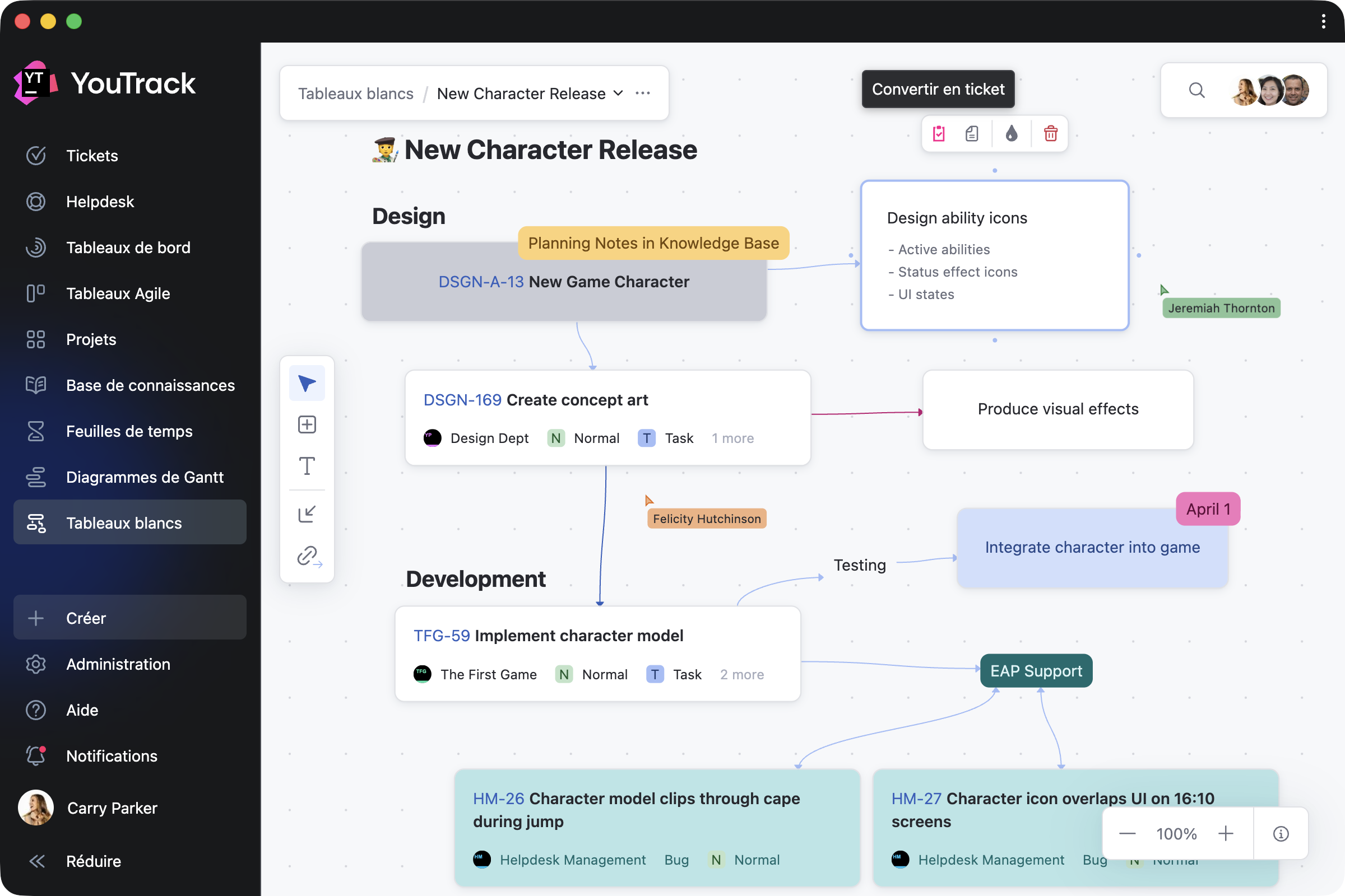 La planification commence souvent avant même que le travail ne soit structuré. Les tableaux blancs YouTrack vous offrent un espace visuel flexible pour esquisser des plans, cartographier le travail existant et réfléchir aux prochaines étapes, en solo ou avec votre équipe. Importez des tickets, des tickets de support et des articles existants, ou repartez de zéro. Une fois vos idées prêtes, transformez-les en tâches d'un seul clic. Les dépendances seront automatiquement synchronisées.