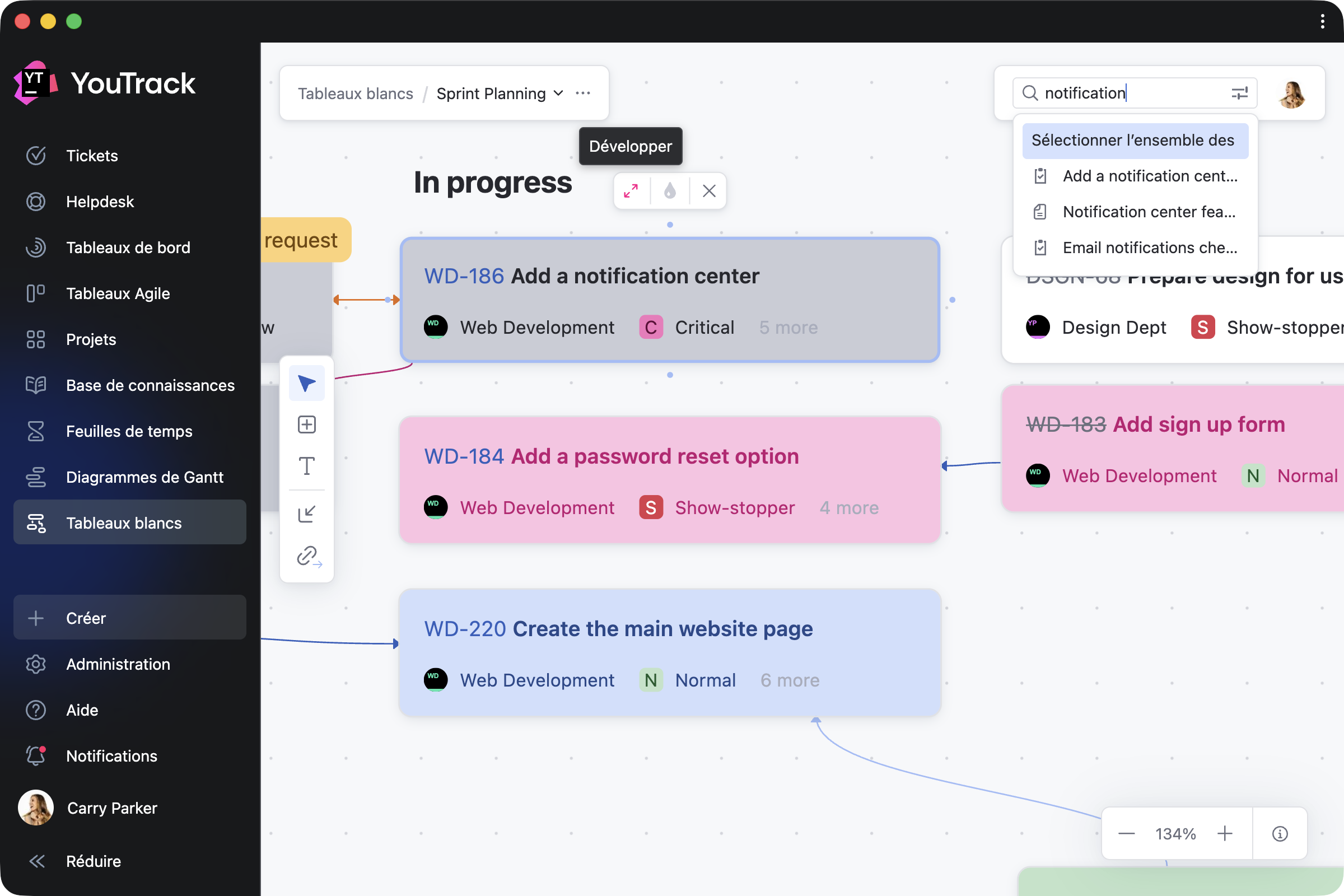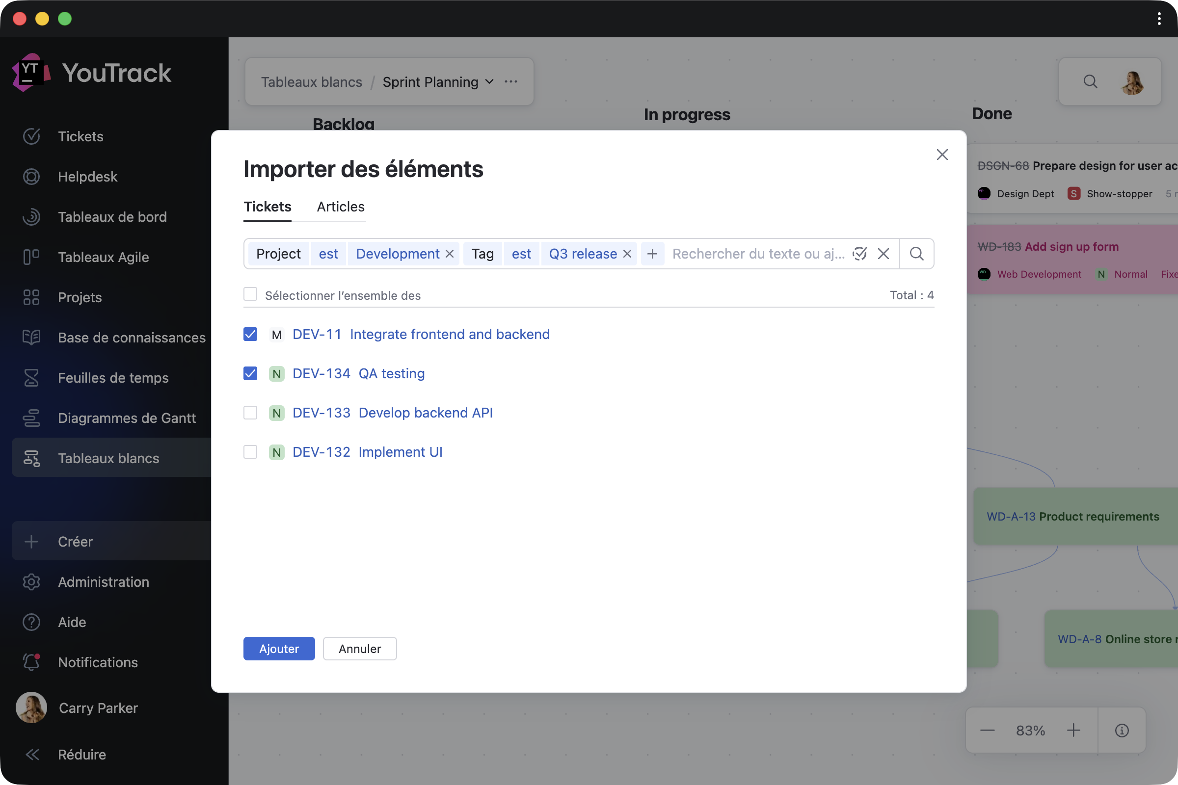 Intégrez des tâches, tickets et articles existants sur le tableau blanc et actualisez-les directement au fil de l'évolution de vos plans. Chaque modification est instantanément répercutée sur l'ensemble de vos projets. Ajoutez les tâches du backlog à une séance de planification, reliez des articles pertinents ou utilisez votre tableau blanc comme une vue d'ensemble vivante du travail en cours.