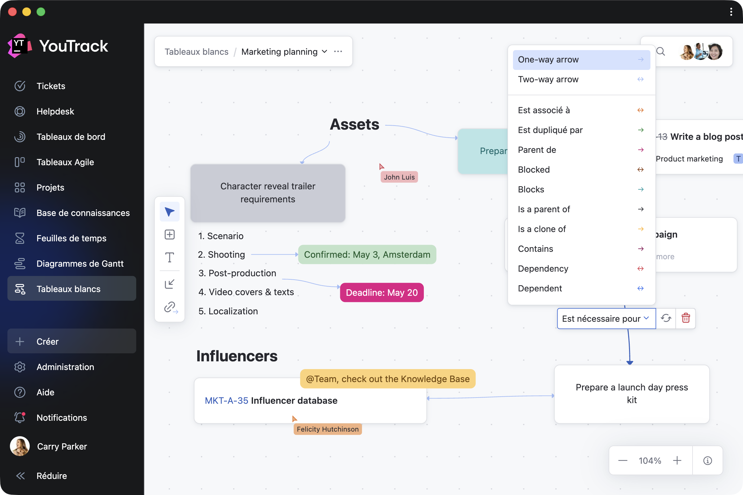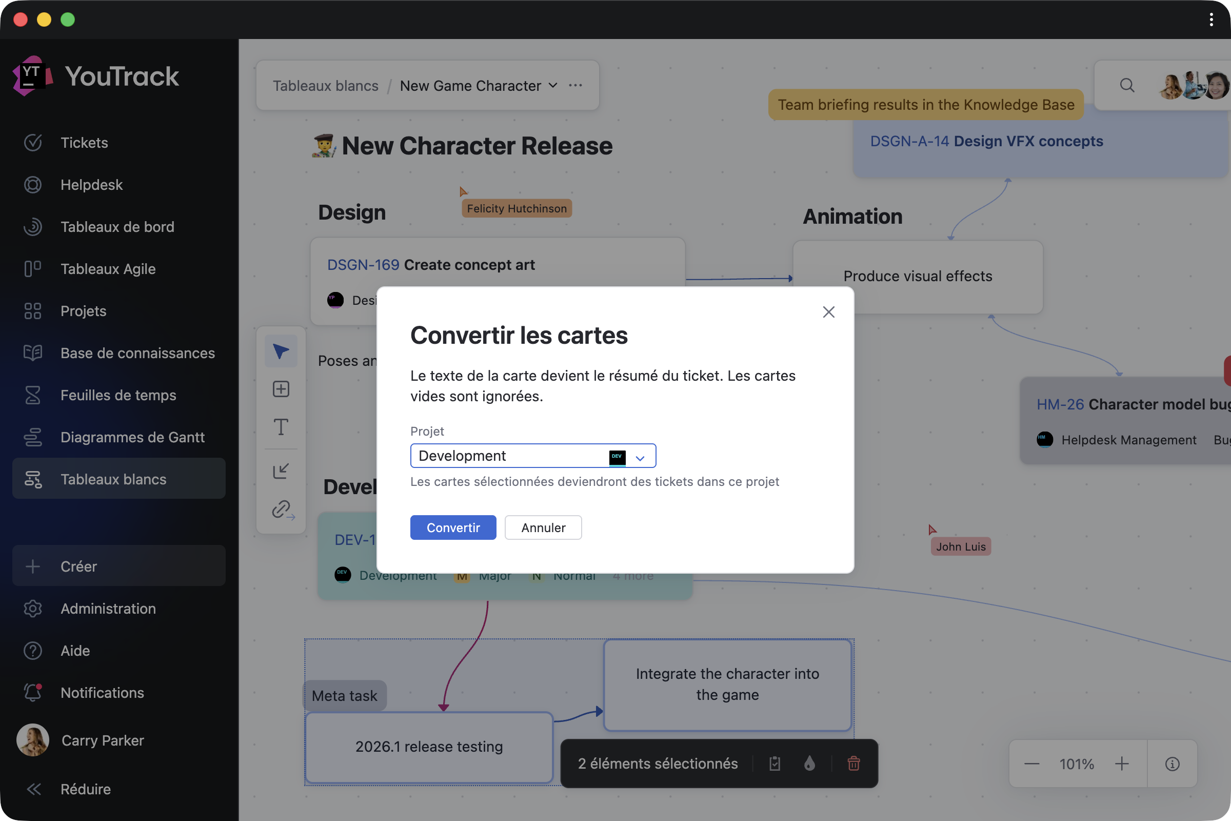 Sélectionnez une carte, choisissez le bon projet, ajoutez des détails et regardez-la se transformer en un véritable ticket ou article YouTrack. Convertissez les éléments un par un ou tous en même temps une fois votre séance de brainstorming terminée. Les dépendances des tâches se synchronisent automatiquement ; vous n'avez rien d'autre à faire.