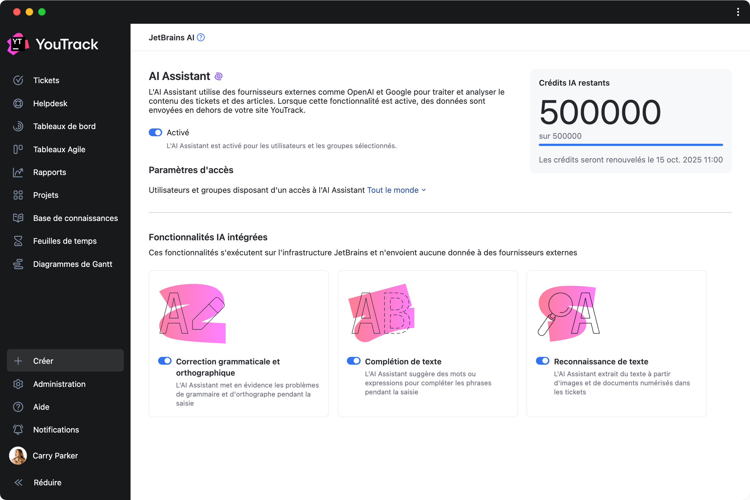 Nous avons mis à jour la page des paramètres de l'AI Assistant pour donner aux administrateurs plus de contrôle sur les fonctionnalités à activer pour votre YouTrack. Nous avons également ajouté un onglet spécifique dans les paramètres de profil afin que chaque utilisateur puisse choisir les fonctionnalités auxquelles il souhaite accéder.